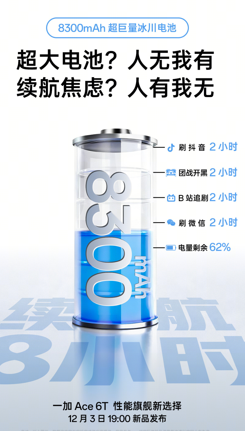 Most a vállalat megerősítette, hogy az Ace 6T az eddig kiadott okostelefonok közül a legnagyobb akkumulátorral rendelkezik majd. Összefoglalva, a Ace 6 a koronát követelte magának a múlt hónapban a 7800 mAh kapacitással, ami 500 mAh-ral több, mint az előző modellnél OnePlus 15. Egy új teasersorozatban a OnePlus elárulta, hogy az Ace 6T ugyanezt az előnyt viseli majd az Ace 6-tal szemben, köszönhetően a 100 W-os vezetékes töltést támogató 8300 mAh-s akkumulátornak.
