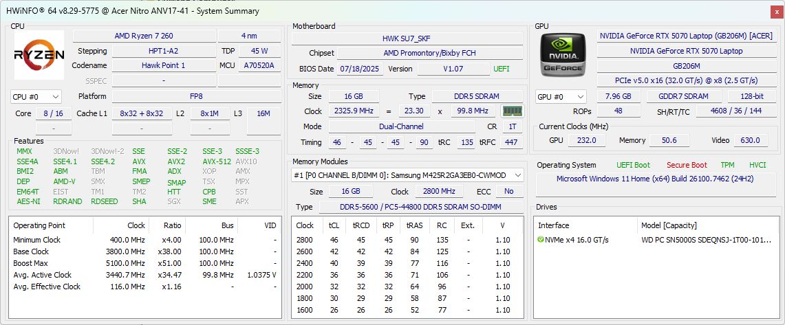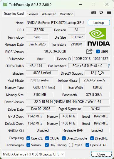 | Acer Nitro v 17 (ANV17-41-R4CJ) AMD Ryzen 7 260 ⎘ NVIDIA GeForce RTX 5070 Laptop ⎘ 16 GB Memória, 1024 GB SSD | List Price: 1199 Euro | 2.7 kg | 24 mm | 17.30" 1920x1080 127 PPI IPS | |