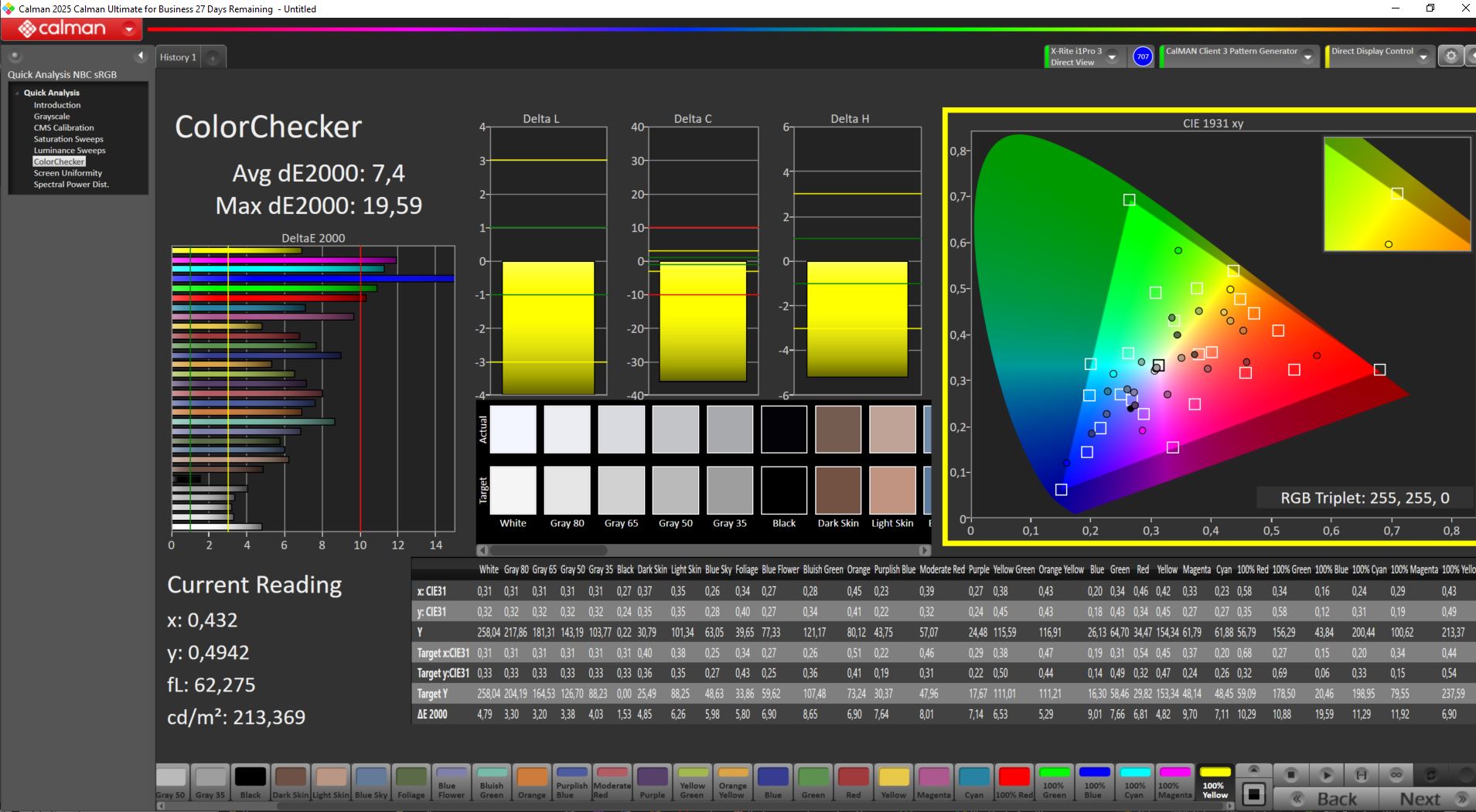 ΔE ColorChecker Calman: 7.4 | ∀{0.5-29.43 Ø4.77}
