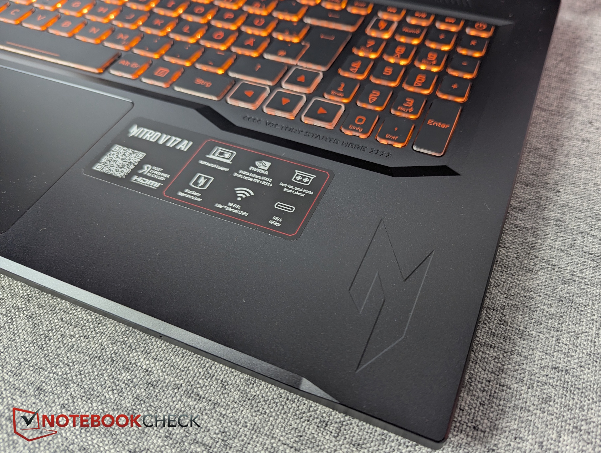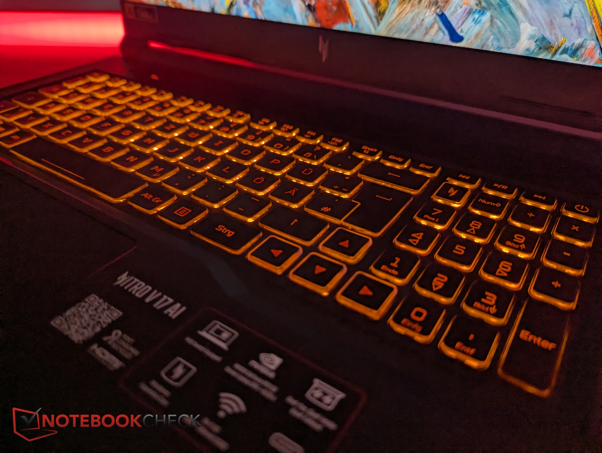 A 17 hüvelykes váz ellenére a numerikus billentyűzet gombjai feltűnően kicsik. A billentyűcímkék narancssárga színnel vannak nyomtatva, ami gyenge kontrasztot eredményez. Van egy dedikált NitroSense billentyű, és az RGB billentyűzet háttérvilágítása egyetlen zónára korlátozódik.