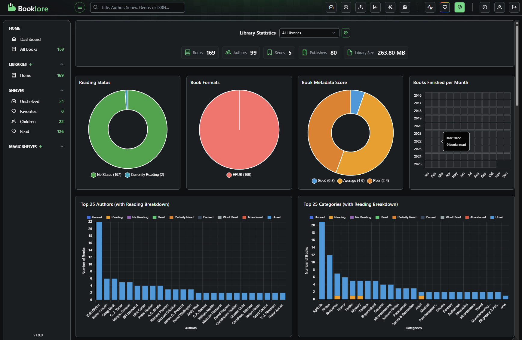A Booklore nem csak egy könyvkezelő, a beépített olvasási funkciók bármely webböngészőt platform-agnosztikus e-olvasóvá alakítanak. Miközben a könyvek letölthetők vagy akár e-mailben is elküldhetők a választott eszközre, a beépített olvasó használatával az olvasási statisztikákat is nyomon követheti, így megtudhatja, hogy mit olvasott, mit olvas jelenleg, kik a kedvenc szerzői, milyen műfajokat olvas leginkább, milyen olvasási szokásai vannak, és még sok minden mást.