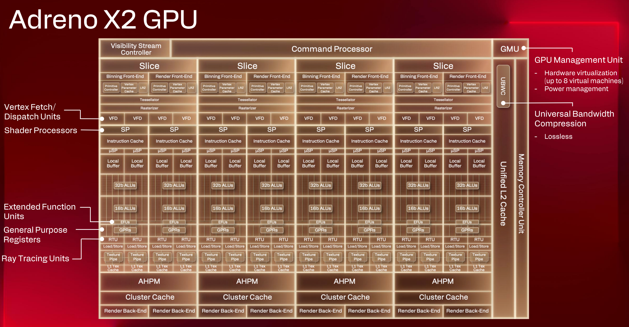 Az Adreno X2 ezt a Qualcomm által "nagy teljesítményű on-chip memóriának" nevezett 21 MB memóriával éri el. Ez lényegében az L3 gyorsítótár egy blokkja, amely minden renderelési szelet számára elérhető (5,25 MB/szelet). A Qualcomm állítása szerint a shader processzorok akár 4 TB/s sebességgel is hozzáférhetnek. Egyébként a GPU akár 228 GB/s sebességgel is elérheti a SoC LPDDR5X-9523 RAM-ját. Az Adreno X2 minden egyes szelete két textúrázó csővezetékkel, négy raytracing egységgel, két render backenddel és két shader processzorral rendelkezik.