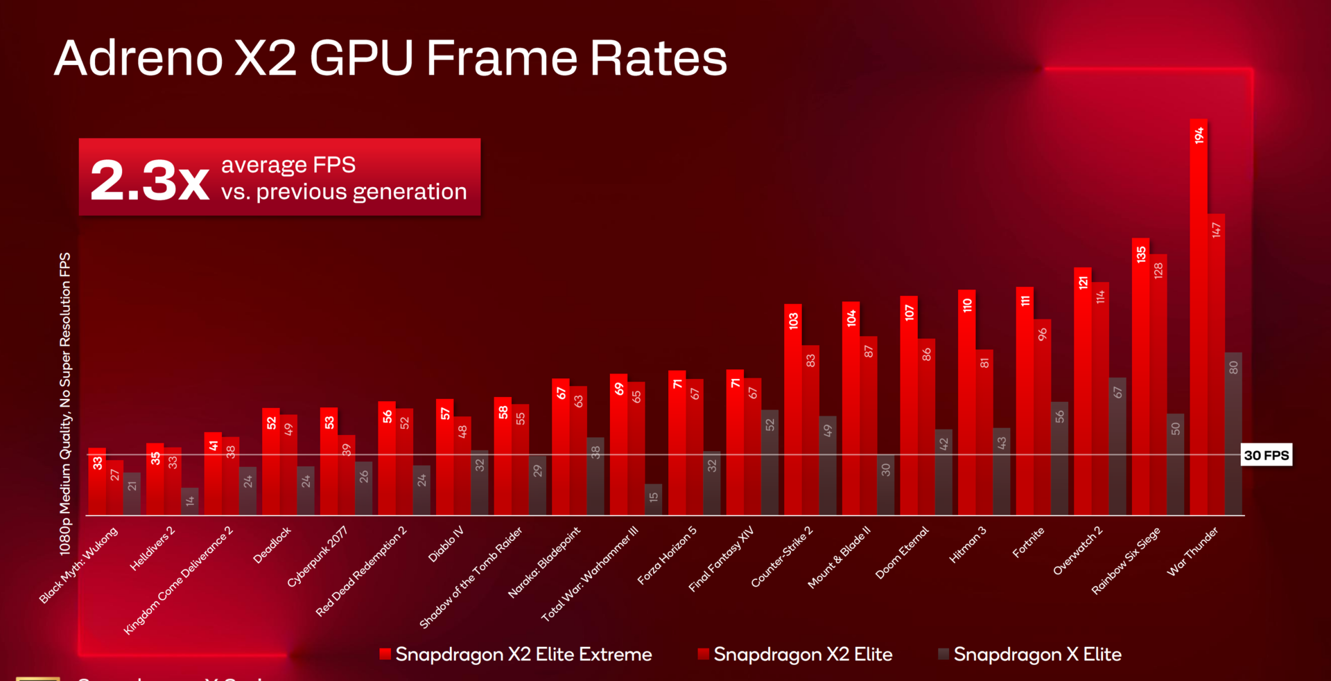 Az Intel és az AMD hasonló specifikációjú alternatíváival összehasonlítva az Adreno X2 meglepően erős. A következő modellekkel vívja meg az ütéseket Radeon 890M és a Arc 140v a címek széles skáláján, például a Diablo IV, a Metro Exodus, a The Witcher 3: Wild Hunt és ismét a War Thunder. Ezek az első fél által készített benchmarkok a Qualcomm referenciaeszközén és nem egy gyártásra kész laptopon készültek. A tényleges különbségek akkor lesznek nyilvánvalóak, amikor a Snapdragon X2 Elite meghajtású laptopok 2026 elején megjelennek.