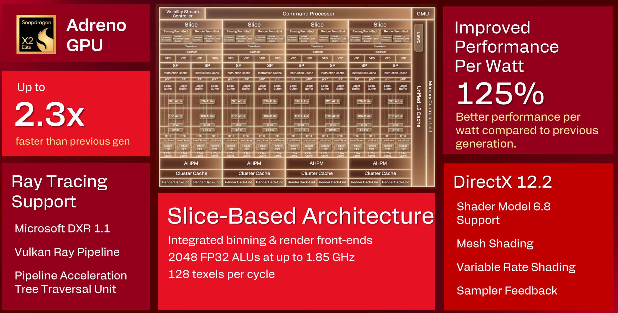 A Qualcomm új információkat tett közzé az új Adreno X2 GPU-ról, amely a Snapdragon X2 Elite CPU-kat. Négy renderelési szelettel rendelkezik, 2048 ALU-val (ami nagyjából 16 AMD WGP-nek felel meg). A vállalat állítása szerint akár 2,3-szor gyorsabb, mint elődje, miközben 125%-kal hatékonyabb az energiafelhasználás. Emellett mostantól támogatja a kernel-szintű csalás elleni szoftvert, így a jövőben a Snapdragon X2 Elite meghajtású laptopokon a Denuvo, a Tencent ACE, a GameGuard, a BattleEye és az Uncheater által védett játékok szélesebb köre futtatható. Érdekes módon a Riot Vanguard nem szerepel a listán.