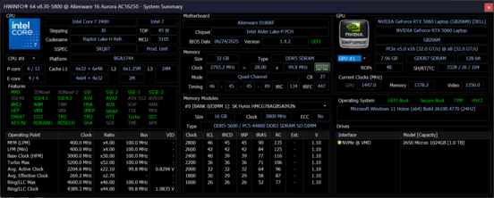 Alienware 16 Aurora Intel Core 7 240H ⎘ Nvidia GeForce RTX 5060 Laptop ⎘ 32 GB Memória | List Price: 1100 USD | 2.6 kg | 15.2 mm | 16.00" 2560x1600 189 PPI IPS | |