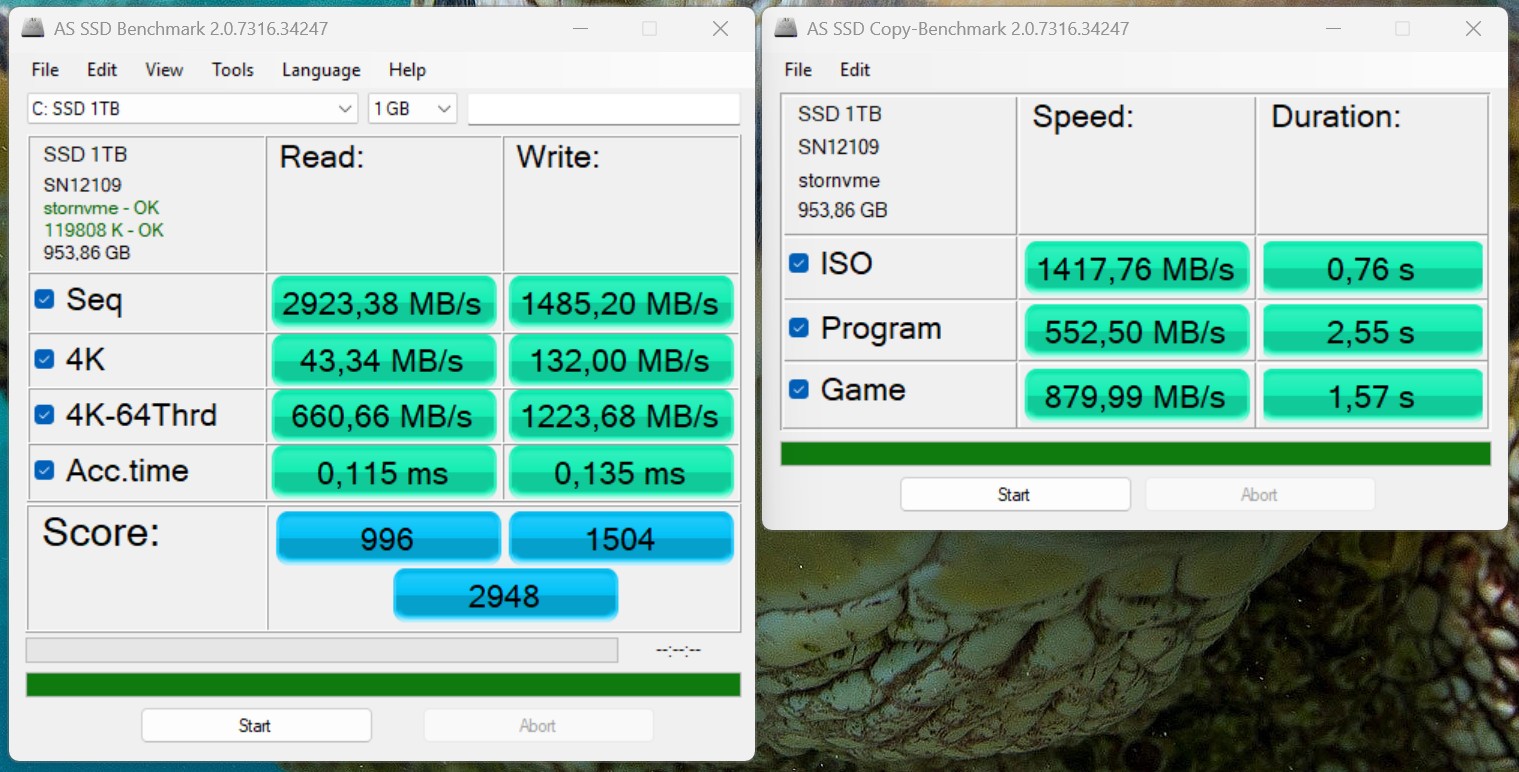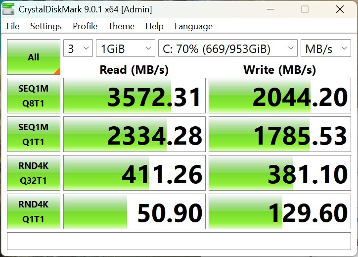 Az Alliwava GH8 1 TB-os SSD-vel érkezik, amelynek gyártója nincs megadva. A PCIe 3.0 x4-en keresztüli csatlakozásnak köszönhetően nem tartozik a leggyorsabb modellek közé, és teljesítményét tekintve az összehasonlítási mezőny alsó határán helyezkedik el. A teljesítmény azonban a mindennapi feladatokhoz elegendő, és az SSD folyamatos terhelés mellett is stabilan működik.