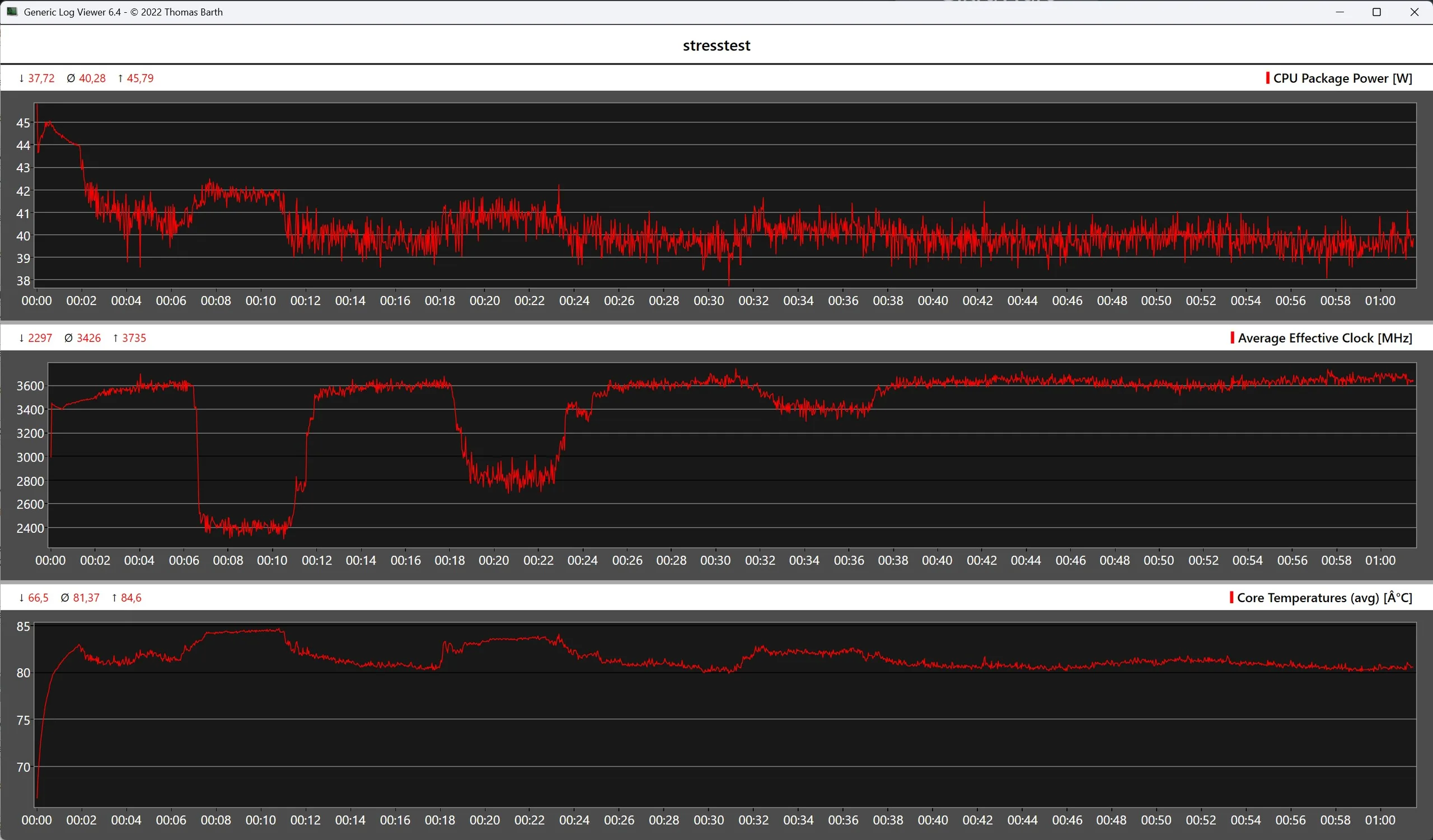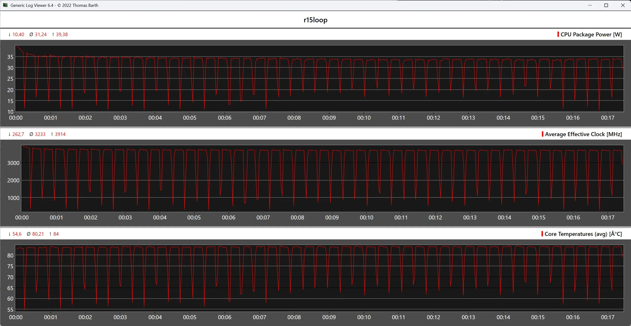 A Cinebench R15 tartóssági teszt bizonyítja, hogy az Alliwava GH8 összességében jól hangolt hűtőrendszerrel rendelkezik. Bár tartós terhelés alatt nem lehet teljesen elkerülni a teljesítmény enyhe csökkenését, ez mérsékelt. Az AMD Ryzen 9 8945HS rövid időre eléri a 40 watt körüli fogyasztást, míg a maximális hőmérséklet alig 84 C fok alatt van.