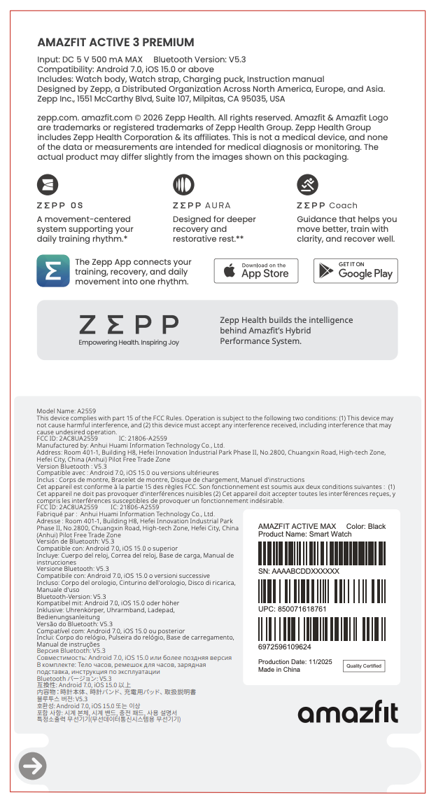 Most az Amazfit Active 3 Premium okosóra ismét megjelent, ezúttal a Szövetségi Kommunikációs Bizottságnál (FCC) benyújtott bejelentésben az Egyesült Államokban. A dokumentumokban A2559-es modellként szerepel, a pedig a termék csomagolásának vázlatát tartalmazza (alábbi képernyőkép), amely megerősíti az "Amazfit Active 3 Premium" nevet.