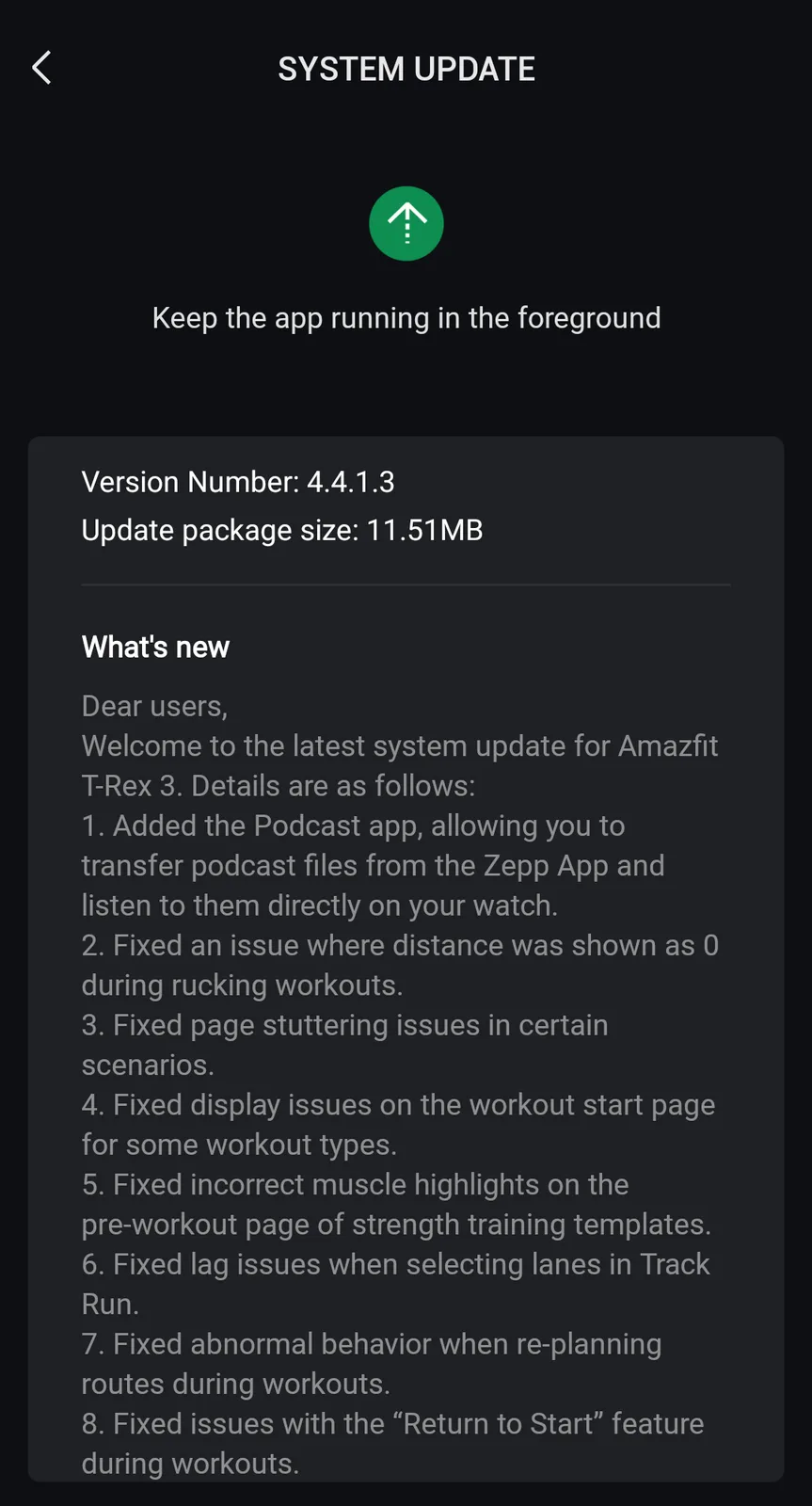 Az Amazfit T-Rex 3 Pro legújabb kiadása, a firmware 4.4.1.3 verziója egy 11,51 MB-os fájl. A több felhasználó által bejelentett új Podcast alkalmazással bővül az okosóra, amely lehetővé teszi a felhasználók számára, hogy közvetlenül a viselhető eszközükről hallgassák a letöltött epizódokat. Ehhez a felhasználóknak a Zepp okostelefonos alkalmazásból kell átvinniük a kiválasztott podcastokat.