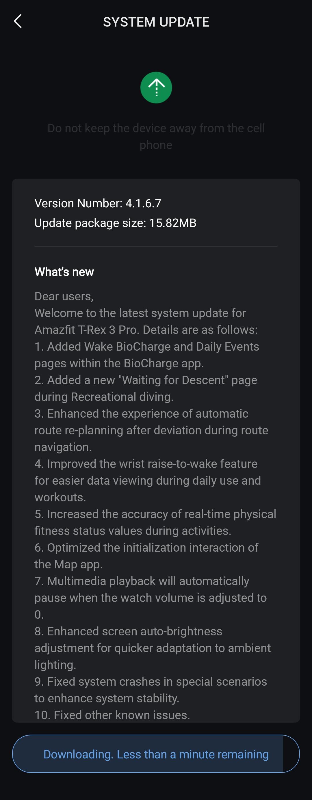 A T-Rex 3 Pro felhasználóinak a csukló felemelés-ébresztés funkciót zökkenőmentesebbnek kell találniuk, és a képernyő fényerejének automatikus beállítása állítólag gyorsabb. Ráadásul, ha nullára csökkenti az óra hangerejét, a zene vagy a podcast mostantól automatikusan szünetel. Mindezeken felül a rekreációs búvárkodáshoz új "Várakozás az ereszkedésre" oldal is rendelkezésre áll. A kiadási megjegyzések homályosan hibajavításokat is említenek, amelyek közül néhány a rendszerösszeomlásokat kezeli.