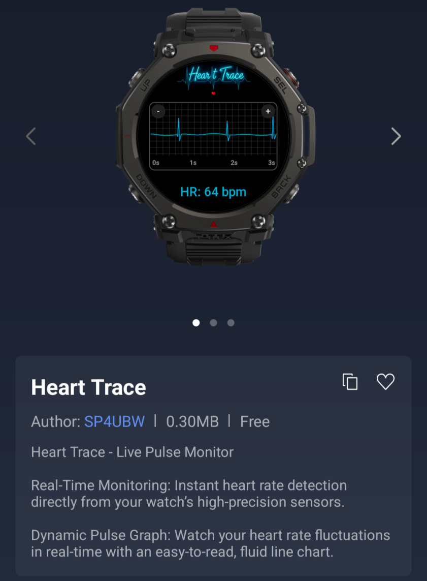 A három Mini alkalmazás közül a legnépszerűbb a Heart Trace, amely jelenleg a második helyen áll a Zepp OS Weekly Top 50 Downloaded Apps Charton. Ez egy élő pulzusmérő, amely lehetővé teszi a felhasználók számára, hogy valós időben tekintsék meg az okosórájuk által gyűjtött pulzusadatokat. A mérések egy dinamikus pulzusgrafikonon jelennek meg, amelyet a fejlesztő "könnyen olvasható, folyékony vonalas grafikonként" ír le.