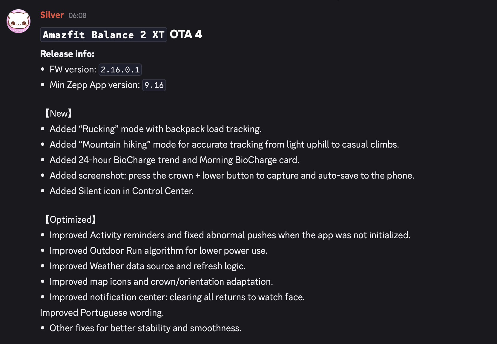 Az Amazfit Balance 2 XT egy új Csendes ikon is helyet kapott a Vezérlőközpontban. Emellett a felhasználók mostantól a korona és az alsó gomb egyidejű megnyomásával képernyőképet készíthetnek. A felvételek automatikusan elmentésre kerülnek a csatlakoztatott okostelefonra. Mindezeken felül optimalizálások vannak a Tevékenység-emlékeztetők, az Időjárás adatforrás és a térkép ikonok esetében. A teljes változtatási naplót az alábbi képernyőképen találja.