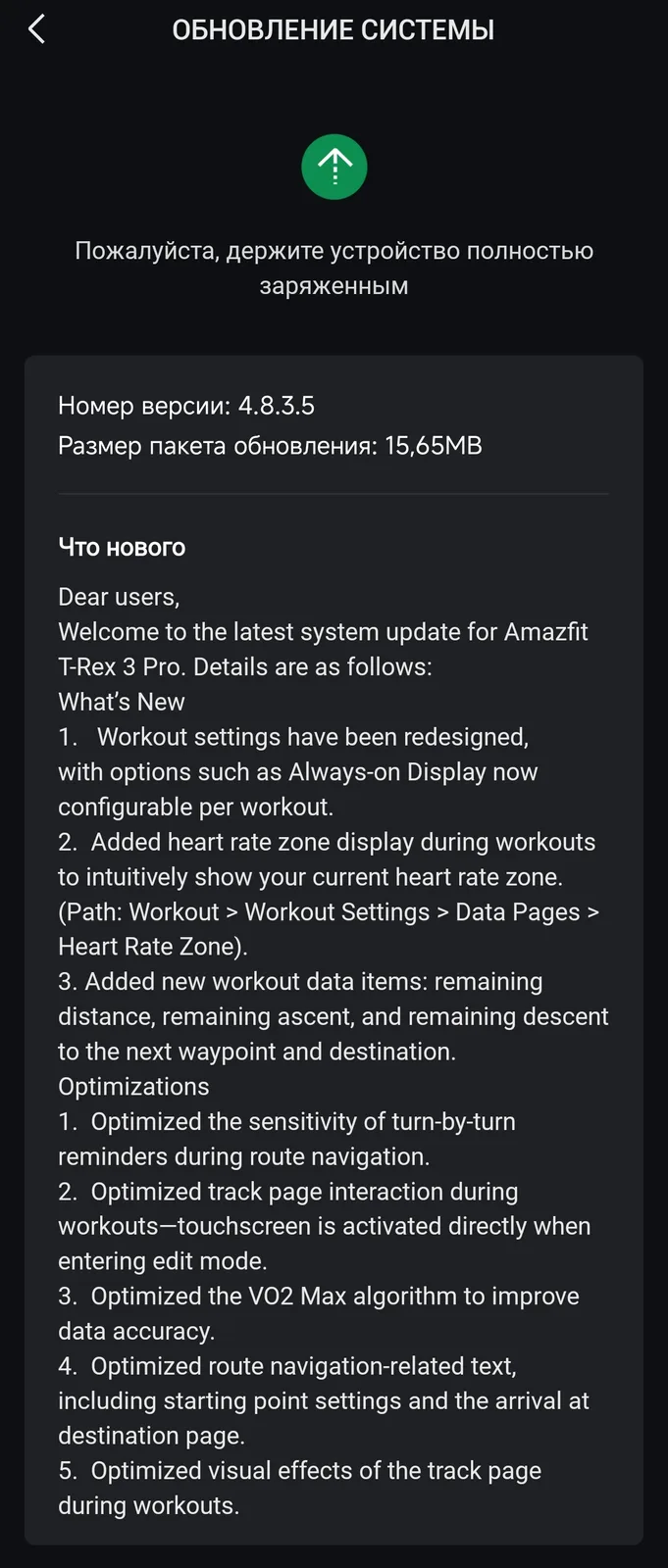 A 4.8.3.5 firmware verzió számos optimalizálást is hoz a T-Rex 3 Pro számára. Javult az útvonal-navigációhoz tartozó turn-by-turn emlékeztetők érzékenysége, valamint a pályaoldal felhasználói élménye. Az Amazfit azt állítja, hogy optimalizálta a VO2 Max számítás mögött álló algoritmust a pontosabb meglátások érdekében. Emellett az útvonal-navigációval kapcsolatos szövegek állítólag továbbfejlesztésre kerültek.