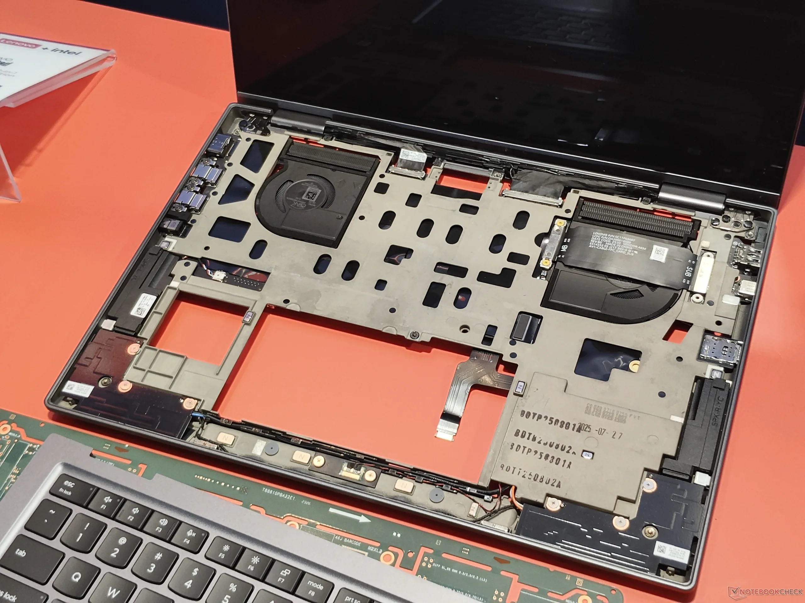 Egy másik előnye a rendelkezésre álló hely jobb kihasználása, ezért "térkeret". Azzal, hogy néhány alkatrészt az új középkeret másik oldalára helyezett, például a kijelző csatlakozóit és a Wi-Fi antennákat, a Lenovo értékes helyet tudott felszabadítani, amit a hűtőrendszer méretének növelésére használt fel - így a korábbi X1 Carbon Gen 13(az Amazonon kapható) mindössze 22,5 W helyett akár 30 W-os hűtést is lehetővé tett teljes terhelés mellett. Ez különösen hasznos az új Panther Lake CPU-k esetében, mivel az Intel Core Ultra X7-nek több energiára van szüksége ahhoz, hogy lényegesen jobban teljesítsen, mint a korábbi Lunar Lake CPU-k. Ráadásul az új, kisebb alaplappal a Lenovo modulárisan tudta kialakítani az USB C portokat, és néhány más portot külön leánylapra helyezett.