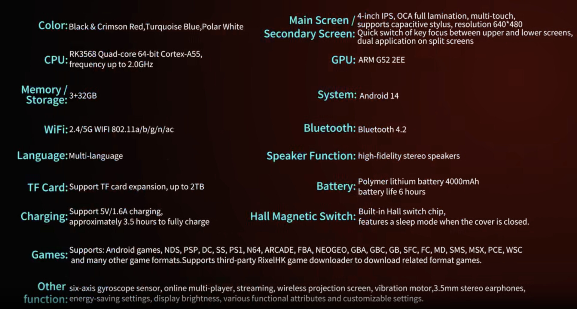 Most azonban, egy csaló AliExpress listázás úgy tűnik, hogy az RG DS-sel kapcsolatban még sok kérdésre idő előtt választ adott. Röviden, az RG DS sokkal gyengébbnek tűnik, mint azt az Anbernic videói sugallták. Konkrétan a lista szerint az Anbernic az RG DS-t Rockchip RK3568 chipkészlettel, 3 GB RAM-mal, 32 GB tárhellyel és 4000 mAh-s akkumulátorral szerelte fel. Ezenfelül a kéziszámítógép állítólag 640 x 480 pixeles kijelzővel rendelkezik, valószínűleg azokkal a kijelzőkkel, amelyek a RG40XX H.