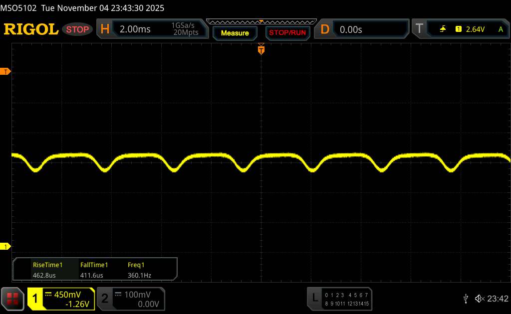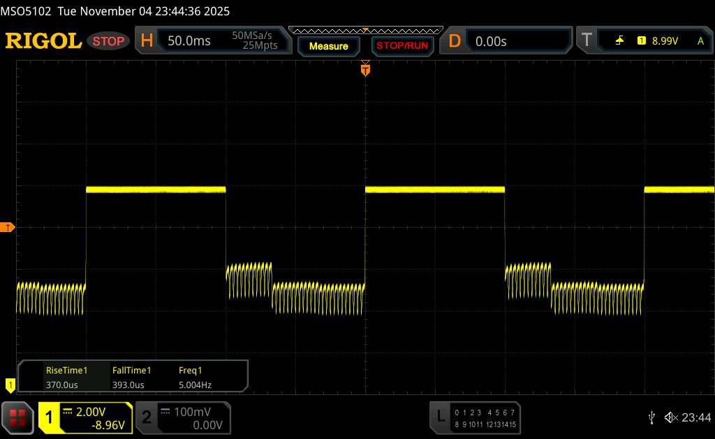 A Pura 80 Pro impulzusszélesség-modulációt használ a képernyő fényerejének szabályozására. A gyártó szerint nagyfrekvenciás, 1440 Hz-es PWM dimmelés áll rendelkezésre, ami minimalizálja a villódzással kapcsolatos hatásokat. A Rigol szoftverrel ehhez nagyon hasonló frekvenciát mérünk.
