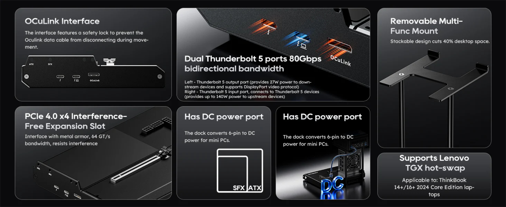 Az Aoostar EG02 külsőre az EG01 kiköpött mása. Egyrészt az előbbi megtartja az utóbbi rögzítési rendszerét és DC tápcsatlakozóját. Hasonlóképpen, megtartja a formavilágot, amelyet a Minisforum DEG1 és a Peladn Link S-1 vagy a Peladn Link S-2. Az Aoostar EG02 azonban az OCuLink és a Thunderbolt 5 csatlakoztathatóságot alkalmazza, bár az Aoostar EG02-hez hasonlóan az OCuLink és a Thunderbolt 5 csatlakoztathatóságot is Minisforum DEG2 és a Peladn Link S-3 előtte.