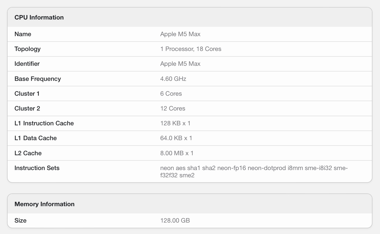 Az elődjéhez képest a M4 Maxaz M5 Max nagyjából 9%-os javulást mutat az egymagos tesztben. A többmagos tesztben azonban az újonnan bevezetett chip körülbelül 14%-kal gyorsabb. Érdekes módon az eredmény az M5 Max-ot a Apple valaha készült leggyorsabb CPU-jává is teszi, 5,4%-os előnnyel a legmagasabb kategóriájú M3 Ultra előtt.