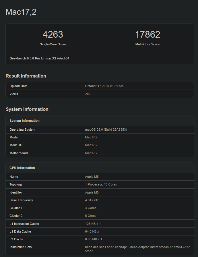 A Geekbench egymagos tesztjén 4,263 pontot ért el, amivel a Apple M5 körülbelül 13%-kal gyorsabb, mint a M5 Apple M4 (3,748-as átlag). A többmagos tesztben az M5 17 862 pontot ér el; ez 17%-os növekedést jelent az előző generációs társához képest (15 173 pont az extra CPU-magok miatt).
