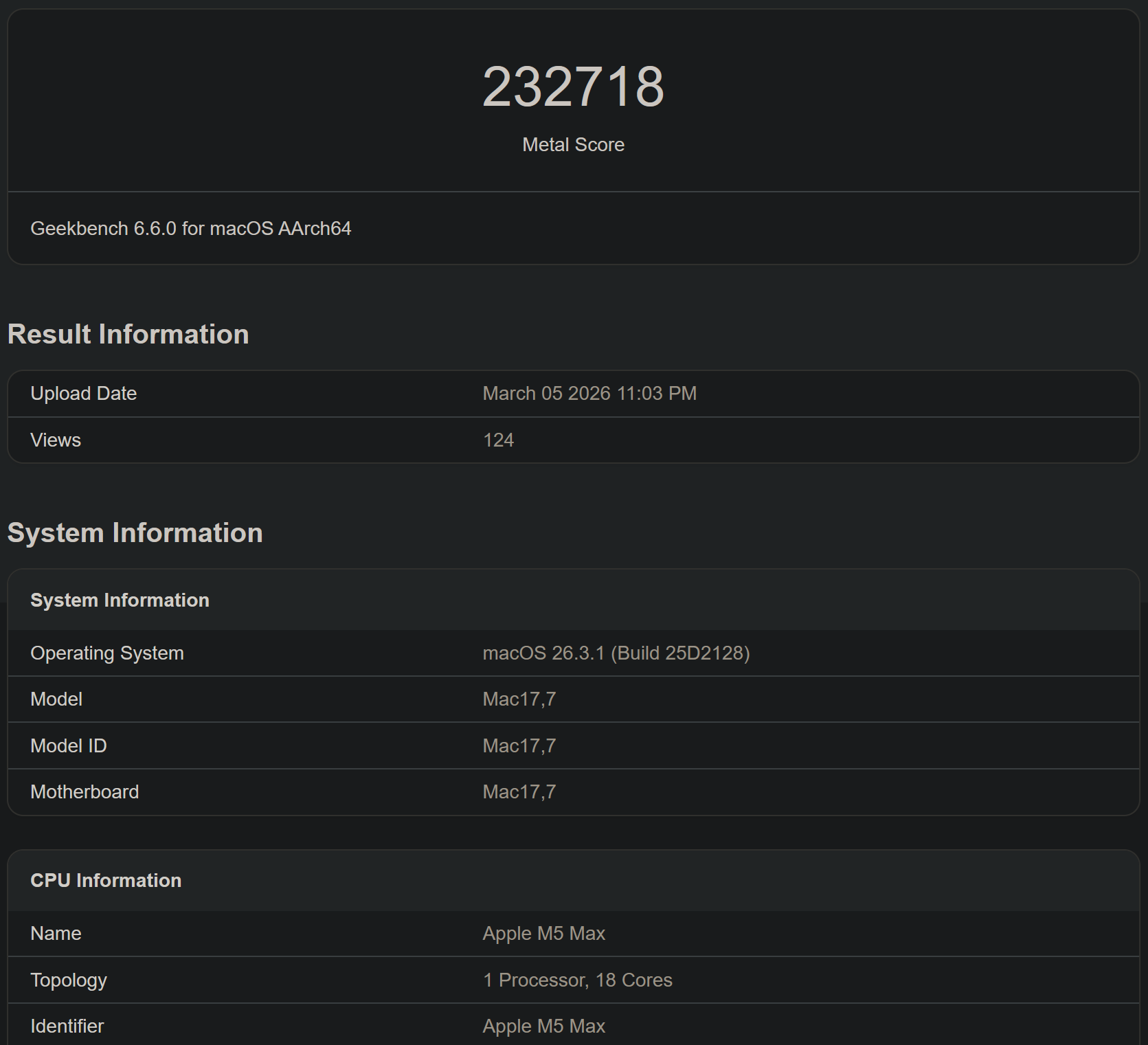 A szóban forgó M5 Max egy 20 GPU-maggal rendelkező, teljes specifikációjú változat. A benchmarkban 232 718 pontot ér el, ami gyakorlatilag majdnem olyan teljesítményűvé teszi, mint egy teljes értékű M3 Ultra kétszer annyi GPU-maggal. Az Nvidia/AMD GPU-kkal való összehasonlítás nem lenne igazságos, mivel a Metal munkaterhelések nincsenek rájuk optimalizálva.