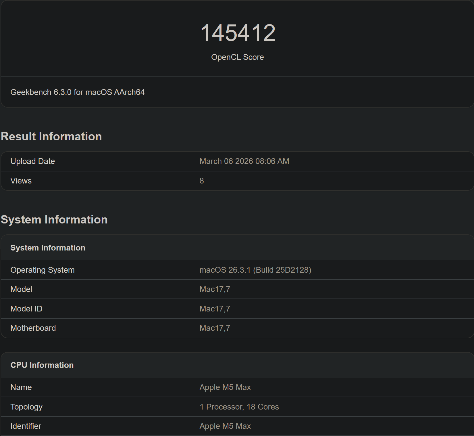 Szerencsére egy OpenCL listing képet ad arról, hogy az M5 Max hol áll a Team Green és Red csapatával szemben. A benchmarkban 145 412 pontot ért el. Itt a GeForce teljesítménye egy szinten van RTX 5070-es laptop változatával, ami mindent összevetve nem rossz, tekintve, hogy 36 SM-je van, és sokkal több energiát fogyaszt. Ráadásul a raytracing teljesítményének javulásának köszönhetően játékban is felveheti a harcot az Nvidia GPU-kkal.