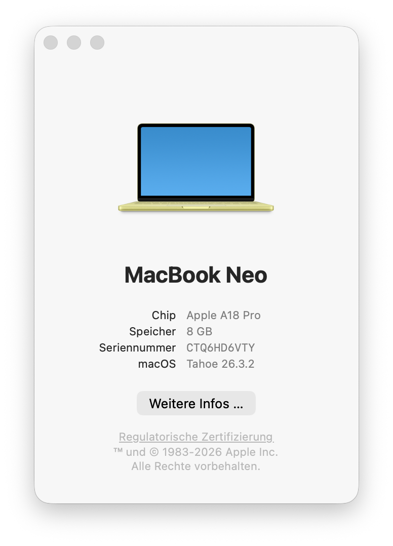 | Apple MacBook Neo 256 GB Apple A18 Pro ⎘ Apple A18 GPU ⎘ 8 GB Memória, 256 GB SSD | List Price: 699€ | 1.2 kg | 12.7 mm | 13.00" 2408x1506 218 PPI IPS | |