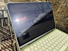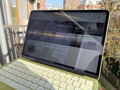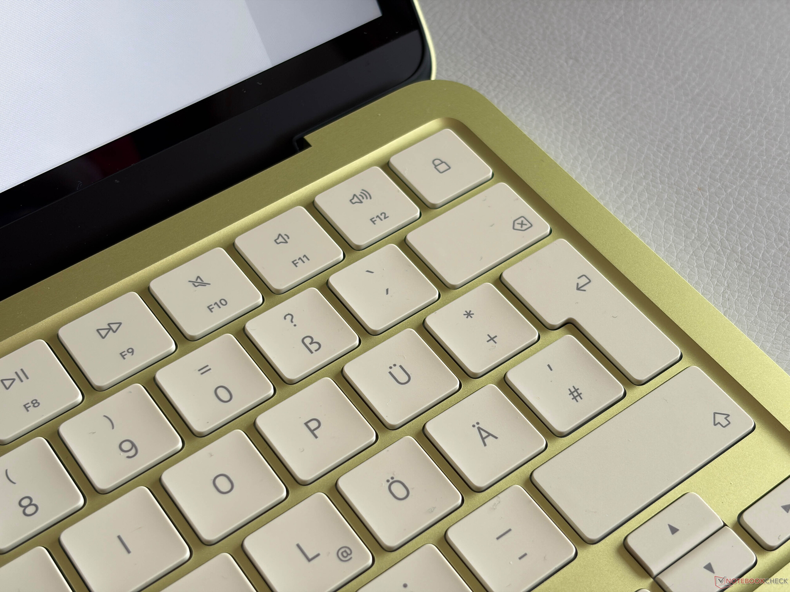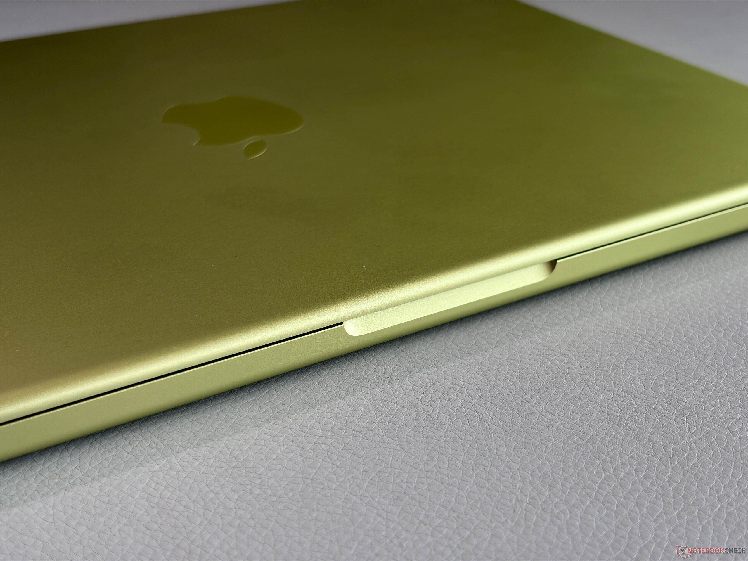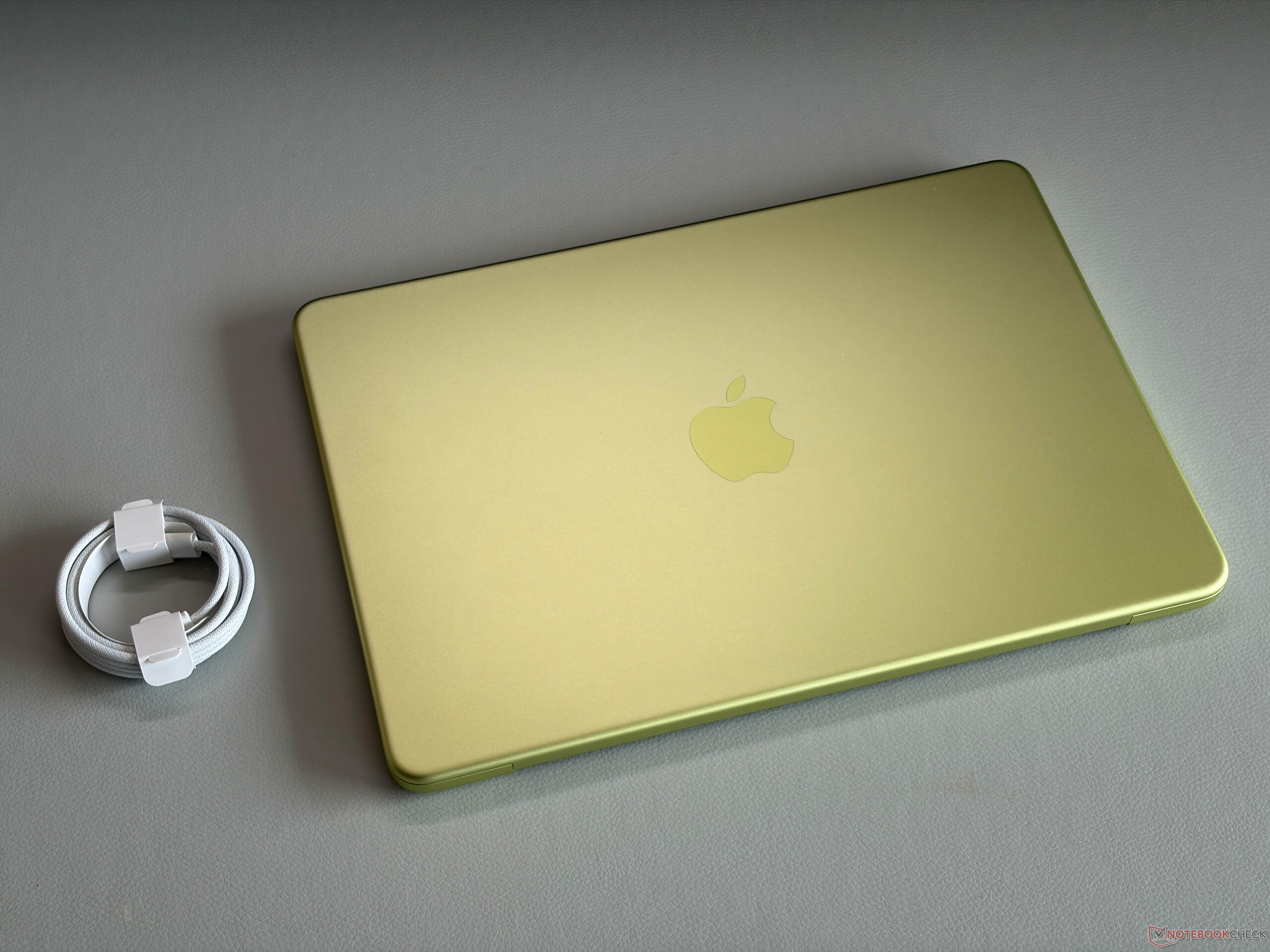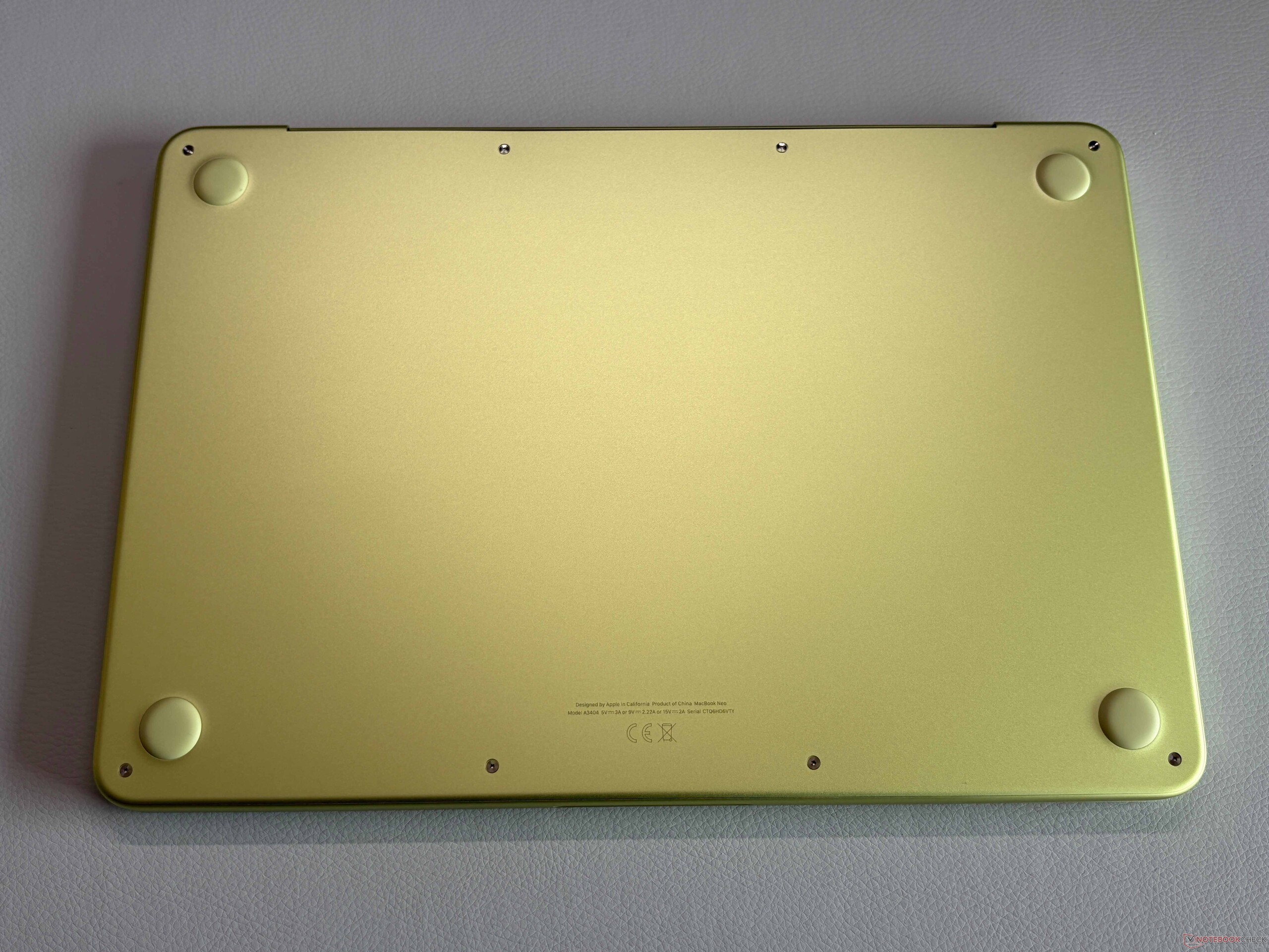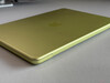 Apple az új MacBook Neót négy különböző színben kínálja, mi pedig a Citrus változatot kaptuk. Határozottan elég friss, de ez nyilván ízlés kérdése. Aki inkább az alacsonyabb profilt részesíti előnyben, annak ott van az ezüst változat is. Apple a gumilábakat és a macOS színeit is színezték, bár ez is változtatható. A billentyűzet a mi modellünkön is enyhén a sárga színárnyalat felé mutat, de ez csak finoman érzékelhető.