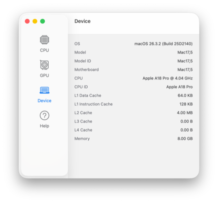 | Apple MacBook Neo 256 GB A18 Pro, A18 GPU, Apple SSD AP0256Z, IPS, 2408x1506, 13" | Microsoft Surface Laptop 13 SD X Plus X1P-42-100, Adreno X1-45 1.7 TFLOPS, , IPS, 1920x1280, 13" | HP Omnibook 5 14 SD X Plus X1P-42-100, Adreno X1-45 1.7 TFLOPS, Samsung PM9C1 MZVL81T0HELB-00BTW, OLED, 1920x1200, 14" | Lenovo IdeaPad Slim 3 14 AHP G10 R7 8840HS, Radeon 780M, Micron 2500 MTFDKBA512QGN, IPS, 1920x1200, 14" | Apple MacBook Air 13 M4 Entry M4 10-Core, M4 8-Core GPU, Apple SSD AP0256Z, IPS, 2560x1664, 13.6" | Átlagos Apple A18 GPU | Az osztály átlaga Subnotebook | |