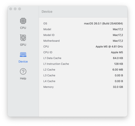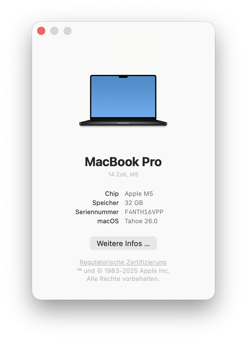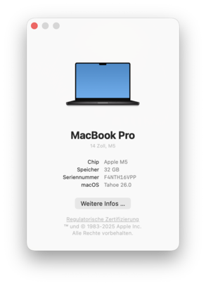 | Apple MacBook Pro 14 2025 M5 Apple M5 (10 Cores) ⎘ Apple M5 GPU ⎘ 32 GB Memória, 1024 GB SSD | Amazon: 1. $1,999.00 Apple 2025 MacBook Pro Lapto... 2. $19.96 BlueSwan Anti-Cracking Hard ... 3. $2,189.13 Apple 2024 MacBook Pro Lapto... List Price: 2739€ | 1.5 kg | 15.5 mm | 14.20" 3024x1964 254 PPI Mini-LED | |
