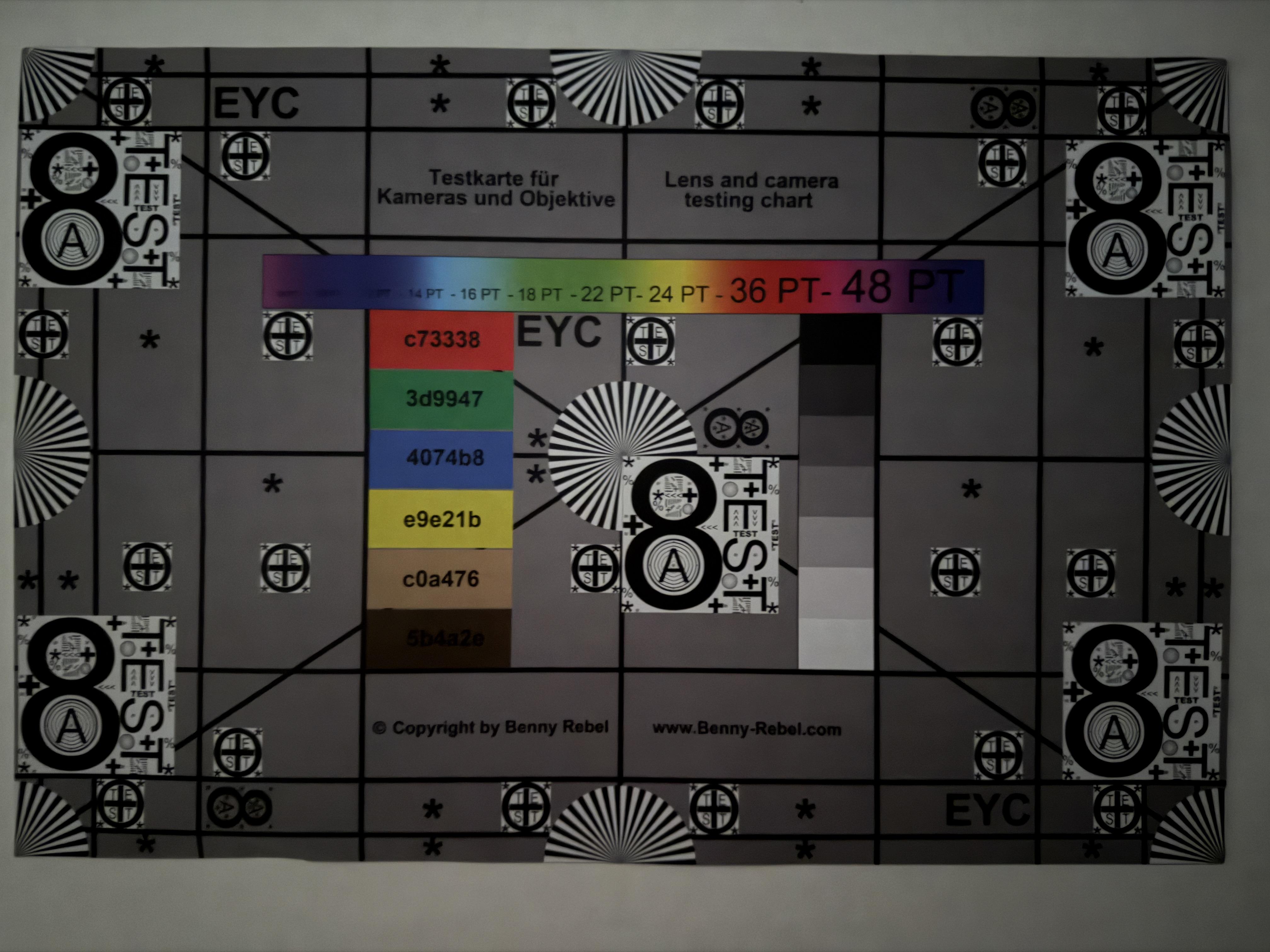 Main cameraMain cameraUltra-wide angle5x zoomLow lightEllenőrzött fényviszonyok mellett a tesztgrafikánk szinte egyenletesen éles volt, még a széleken is alig volt elmosódás. A kép közepén azonban a részletek kissé túlélesítettnek tűntek, és kisebb aberrációkat mutattak.