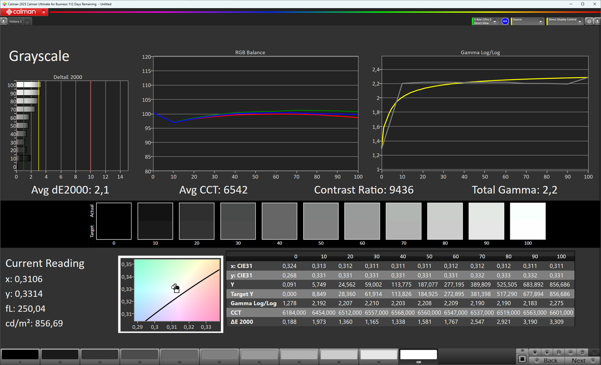 A ColorChecker kép nagyon jó volt, egyetlen szín sem haladta meg a 10-es DeltaE értéket. A legnagyobb eltérést (dE 9,9) a cián szín mutatta, amely túlságosan világos.