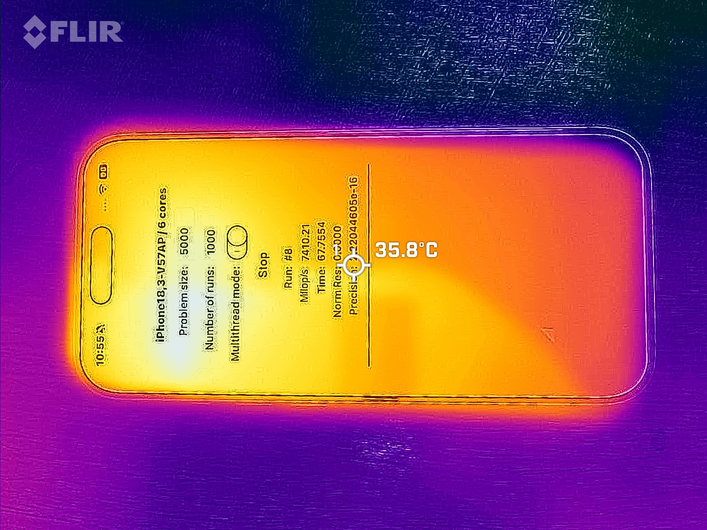 Az akár 43,3 °C-os felületi hőmérséklettel az iPhone 17 terhelés alatt is hűvösebb marad, mint az iPhone 16. A 3DMark stresszteszteken azonban a tesztkészülék a maximális teljesítményének egyharmadát veszíti el. Itt is az iPhone 16 egy leheletnyivel hatékonyabb.
