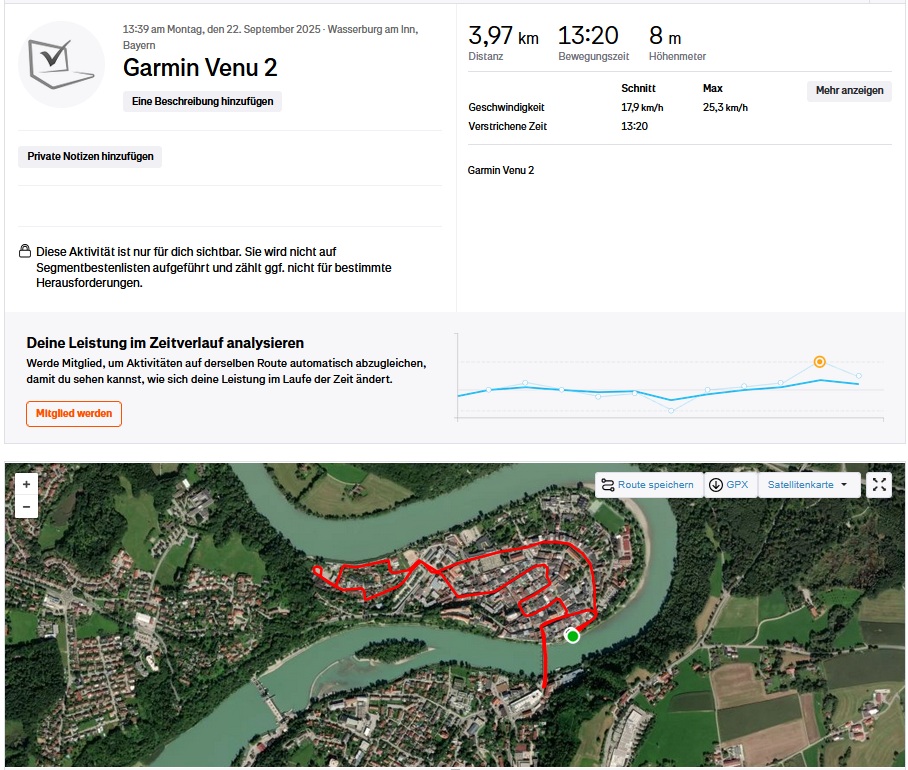 Az iPhone 17 a GPS, a GLONASS, a Galileo, a QZSS, a BeiDou és a NavIC műholdas navigációs szolgáltatásokat használja kettős sávban a helyzetmeghatározáshoz. Amint azt rövid kerékpártúránk is mutatja, az okostelefon tehát kiválóan alkalmas a navigációra. A Garmin Venu 2 fitnesz-okosórával összehasonlítva az iPhone 17 az útvonal egyes szakaszain kisebb pontatlanságokat mutat, de ezek összességében elhanyagolhatóak.