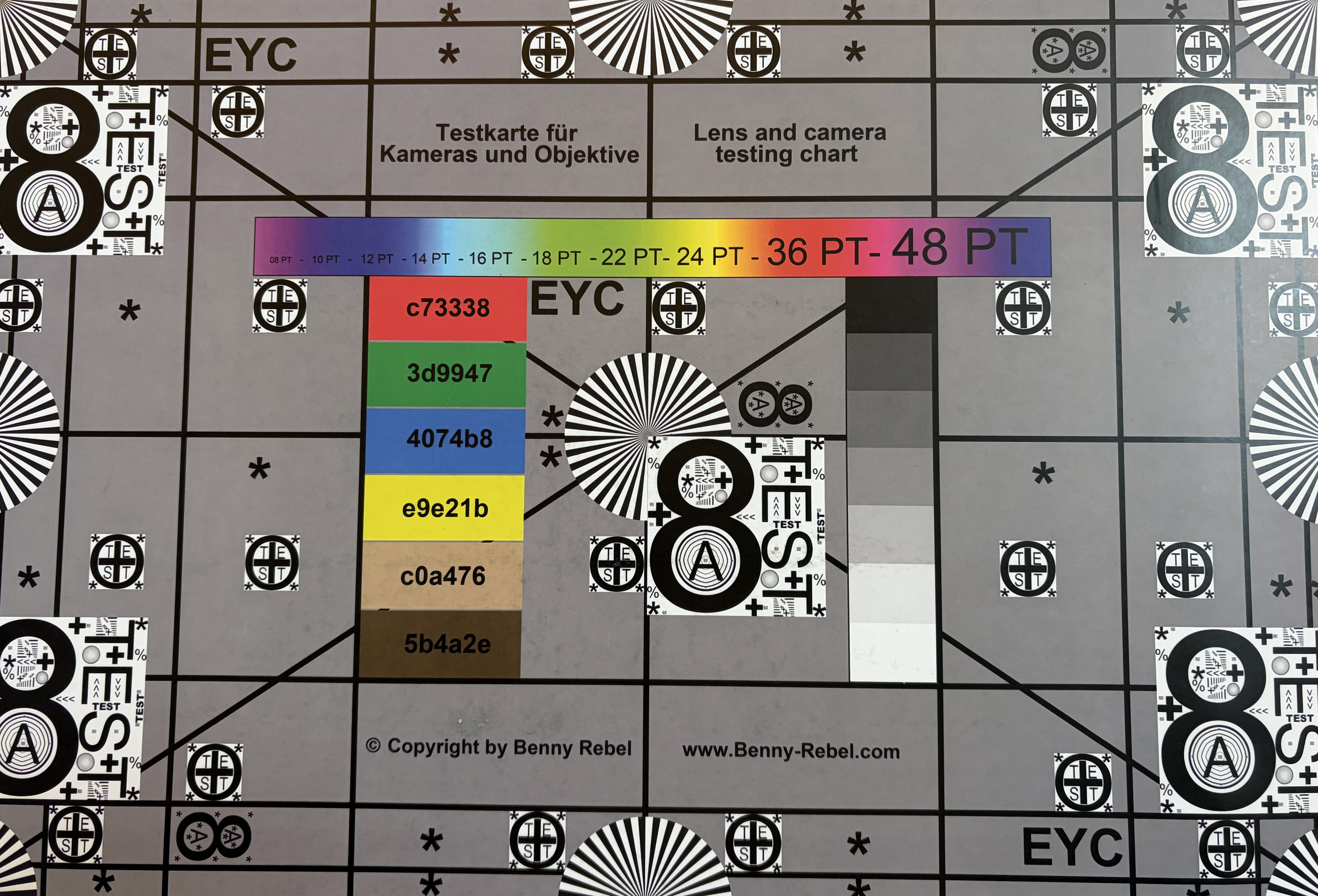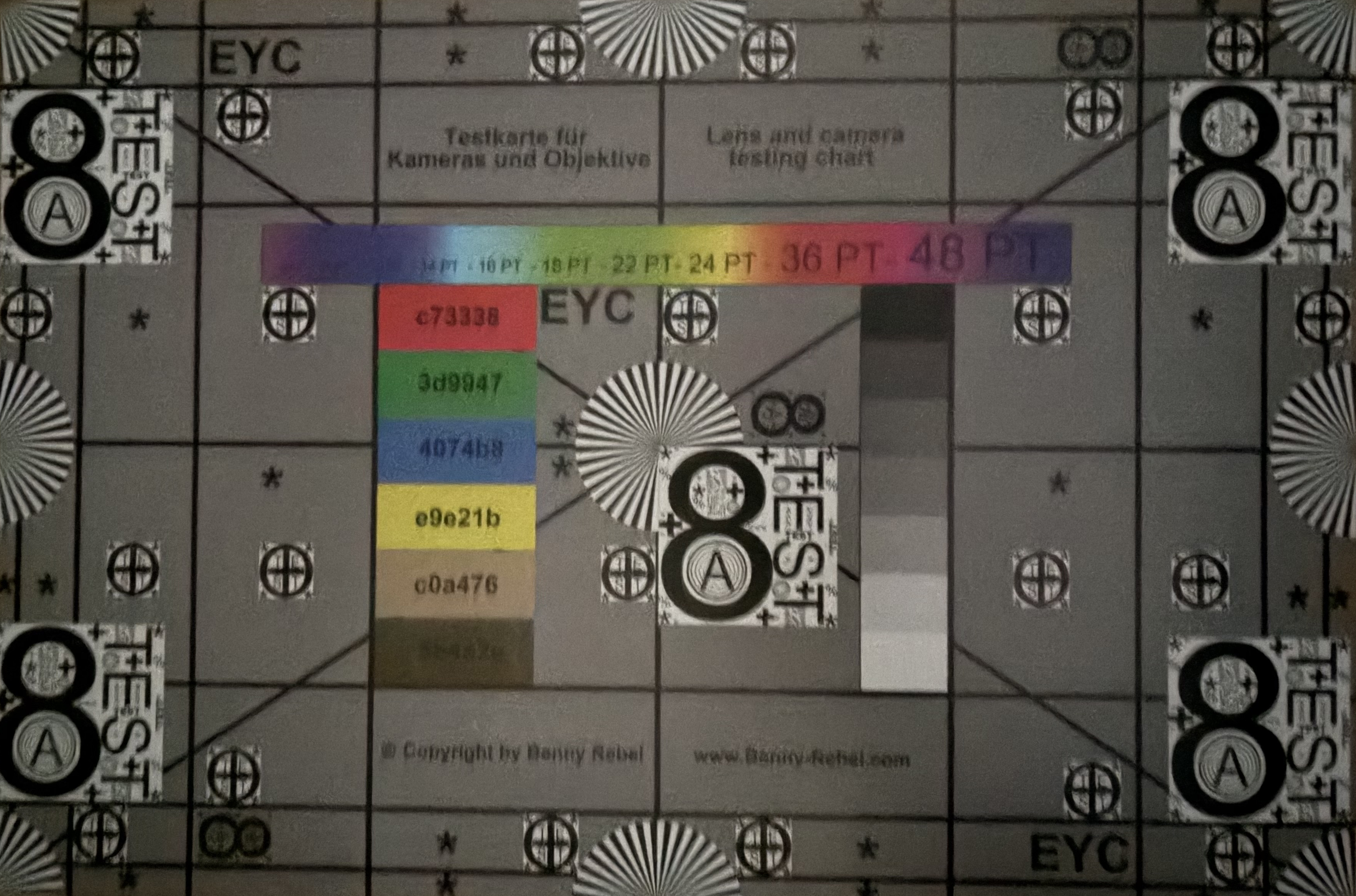 Main cameraMain cameraUltra wide-angleLow lightEllenőrzött fényviszonyok mellett a fő kamera ismét megmutatja, hogy képes a színek pontos megjelenítésére. A tesztdiagram még 1 lux maradék fény mellett is nagyon jól felismerhető, és meglehetősen élesen rögzíti a képeket, amit aligha tud más okostelefon-kamera elérni.