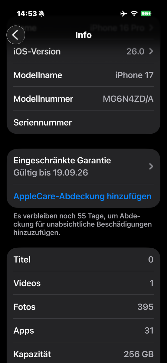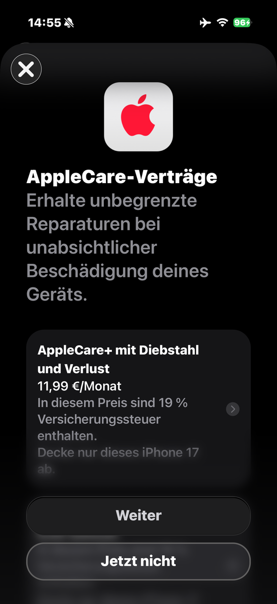 Az iPhone 17 készülékre 12 hónapos garanciát vállal a Apple. Ez a AppleCare+ szolgáltatással meghosszabbítható, amely fedezi a javítást nem szándékos sérülés esetén (önrészesedés függvényében). Opcionálisan a lopás vagy elvesztés is fedezhető.
