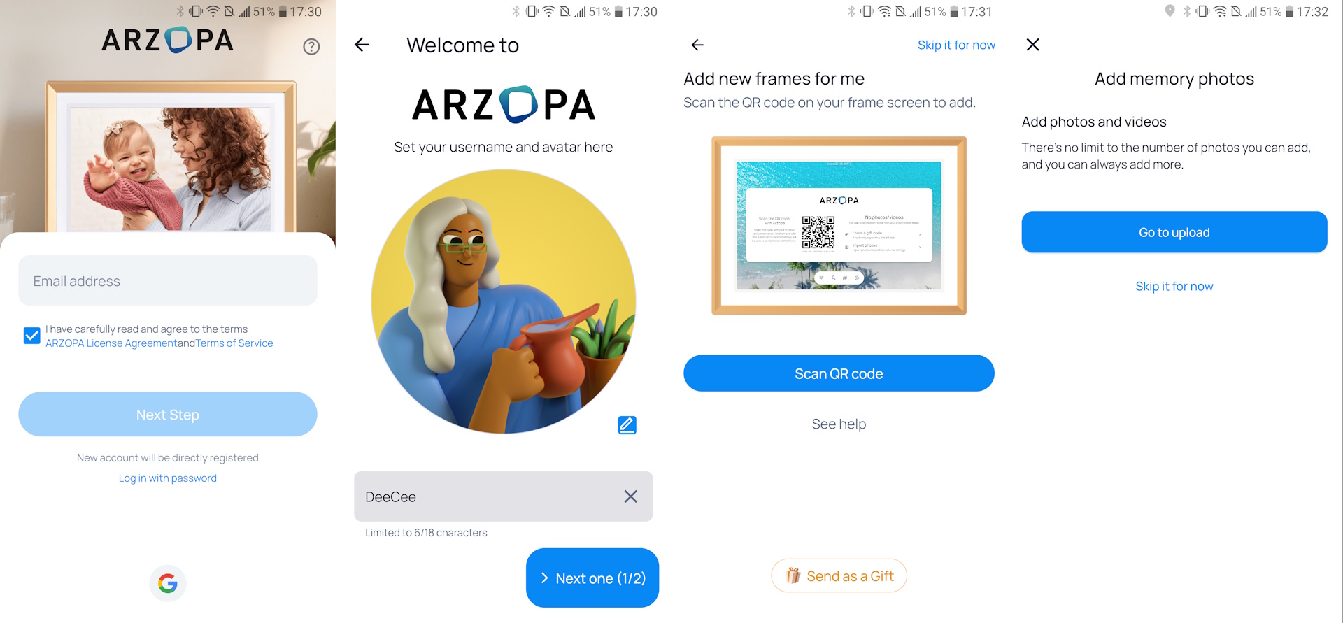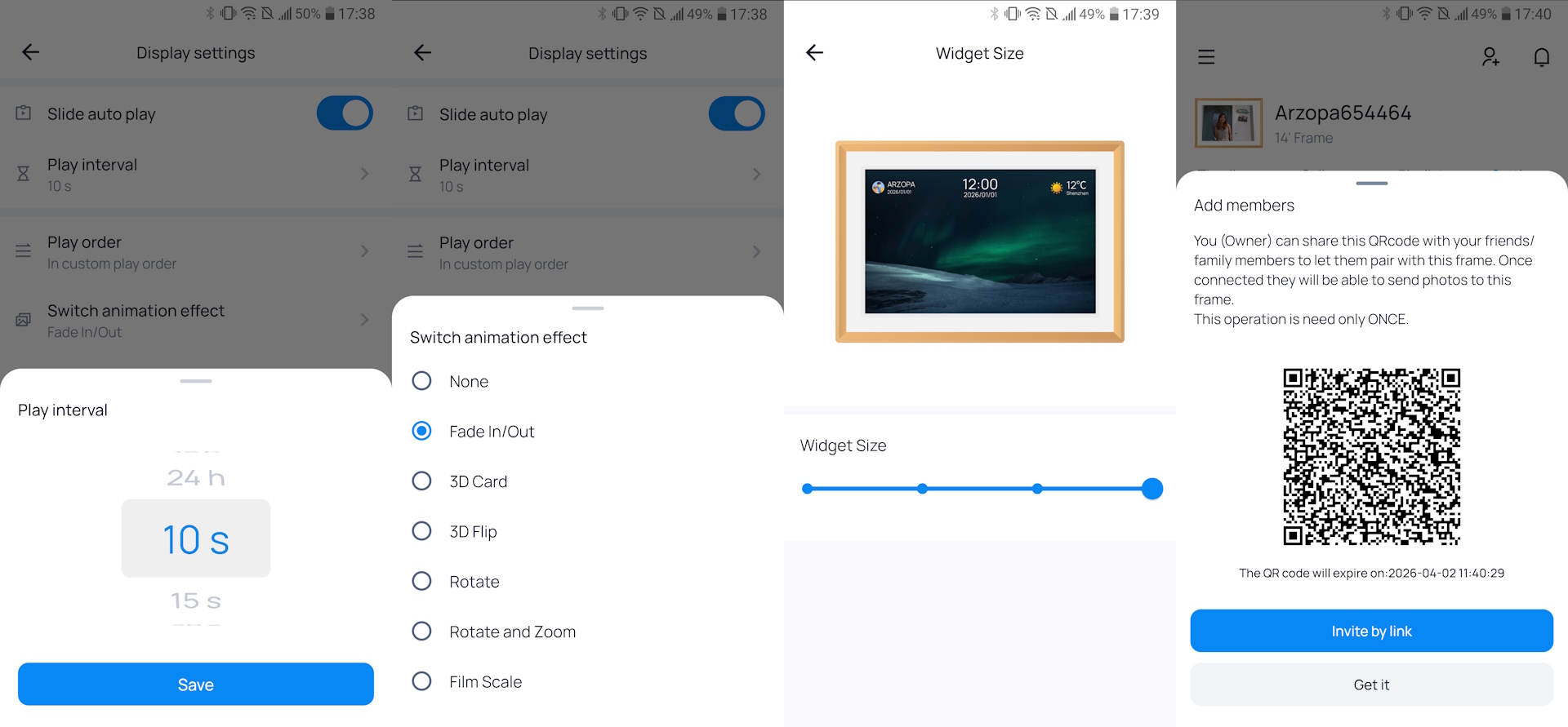 A szoftver könnyen telepíthető, és a fénykép hozzáadása csak másodperceket vesz igénybe. Az Arzopa kerethez való hozzáférés megosztható a barátokkal és a családdal, így mindenki távolról, az alkalmazáson keresztül tölthet fel fotókat. Az alkalmazás lehetővé teszi azt is, hogy a vásárlók ajándékozás előtt előzetesen feltöltsenek egy áldást és egy fotót, a tulajdonosok pedig ajándékkódokat adhatnak hozzá további eseményfotók importálásához.