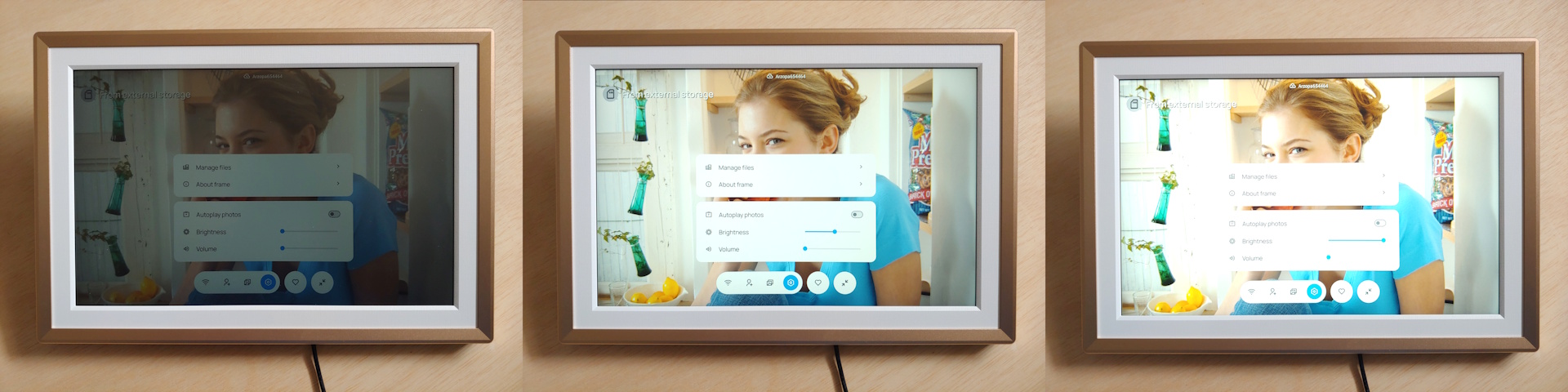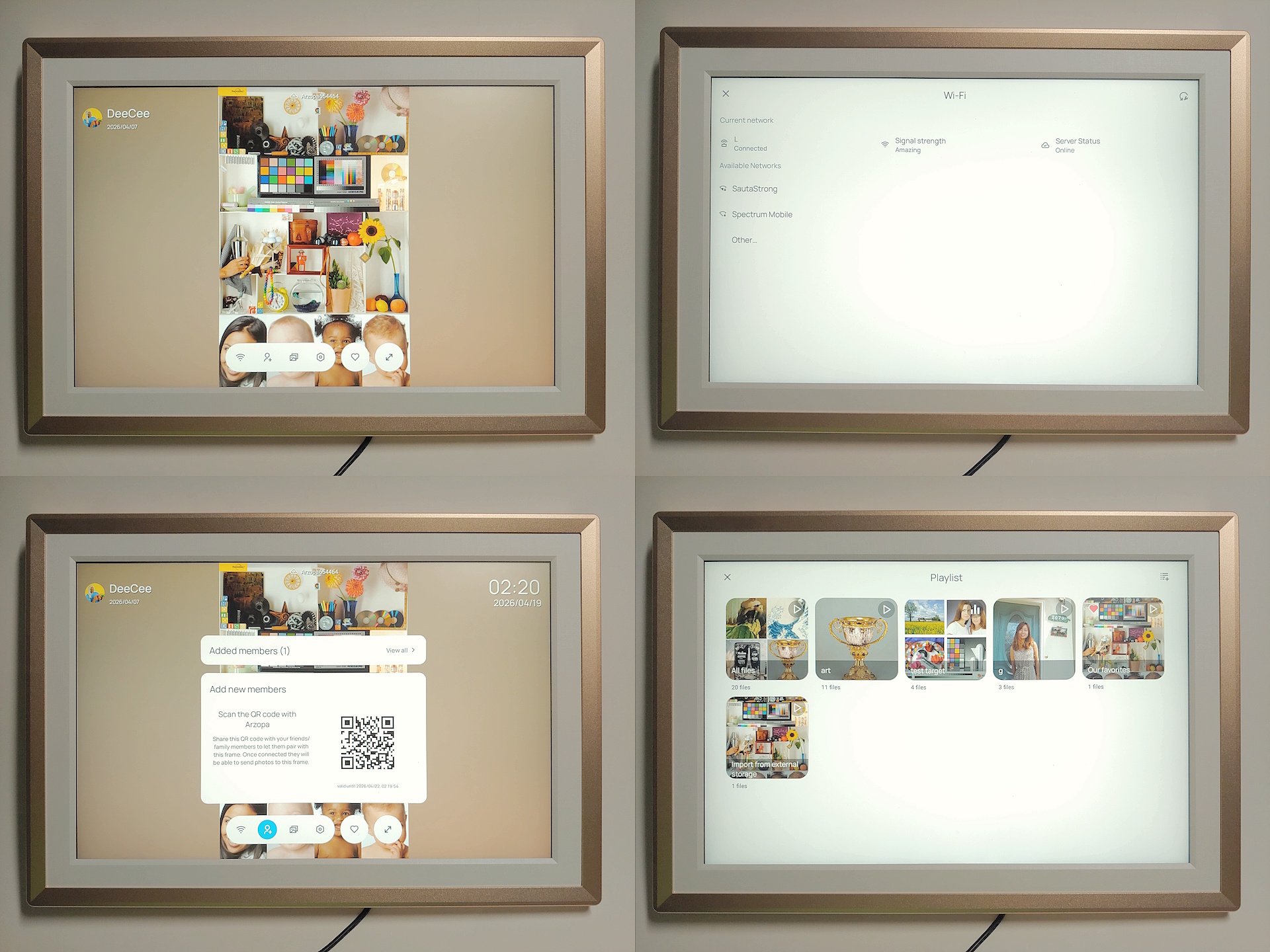 A Wi-Fi beállítások megkönnyítik az új kapcsolat hozzáadását, bár a proxied hálózatok nem támogatottak. A felhasználói beállítások lehetővé teszik új tagok gyors felvételét, akik távolról is feltölthetnek fényképeket. A Fotók menü lehetővé teszi a felhasználók számára, hogy SD-kártyáról lejátsszák a médiát, USB-n keresztül átvigyék a fájlokat, töröljék az elemeket vagy visszaállítsák a keretet, a nagy könyvtárak rendszerezéséhez pedig mappák állnak rendelkezésre. A rendszerbeállítások a fényerőt, a hangerőt, a fényképek automatikus lejátszását és a fájlkezelést szabályozzák.