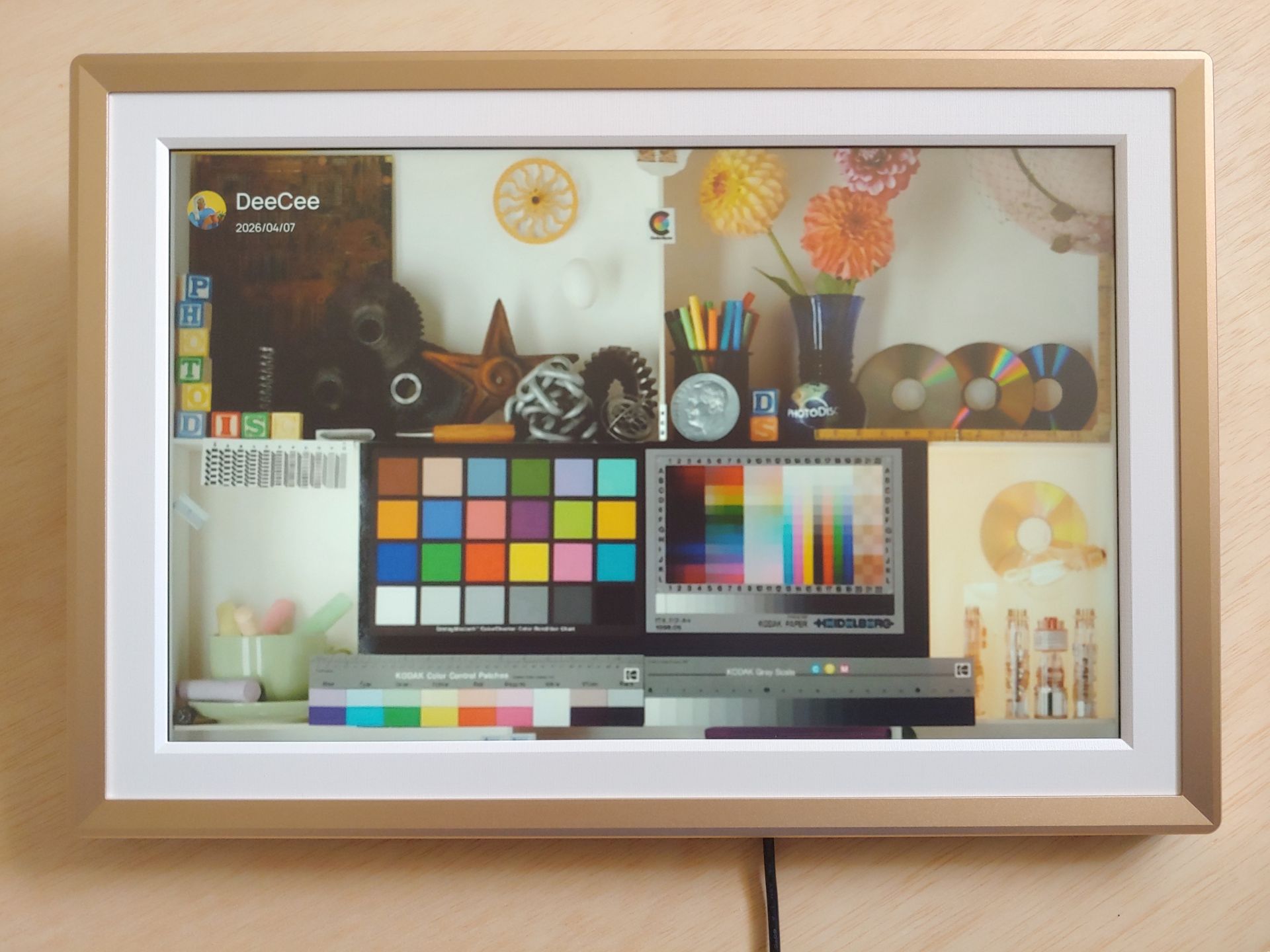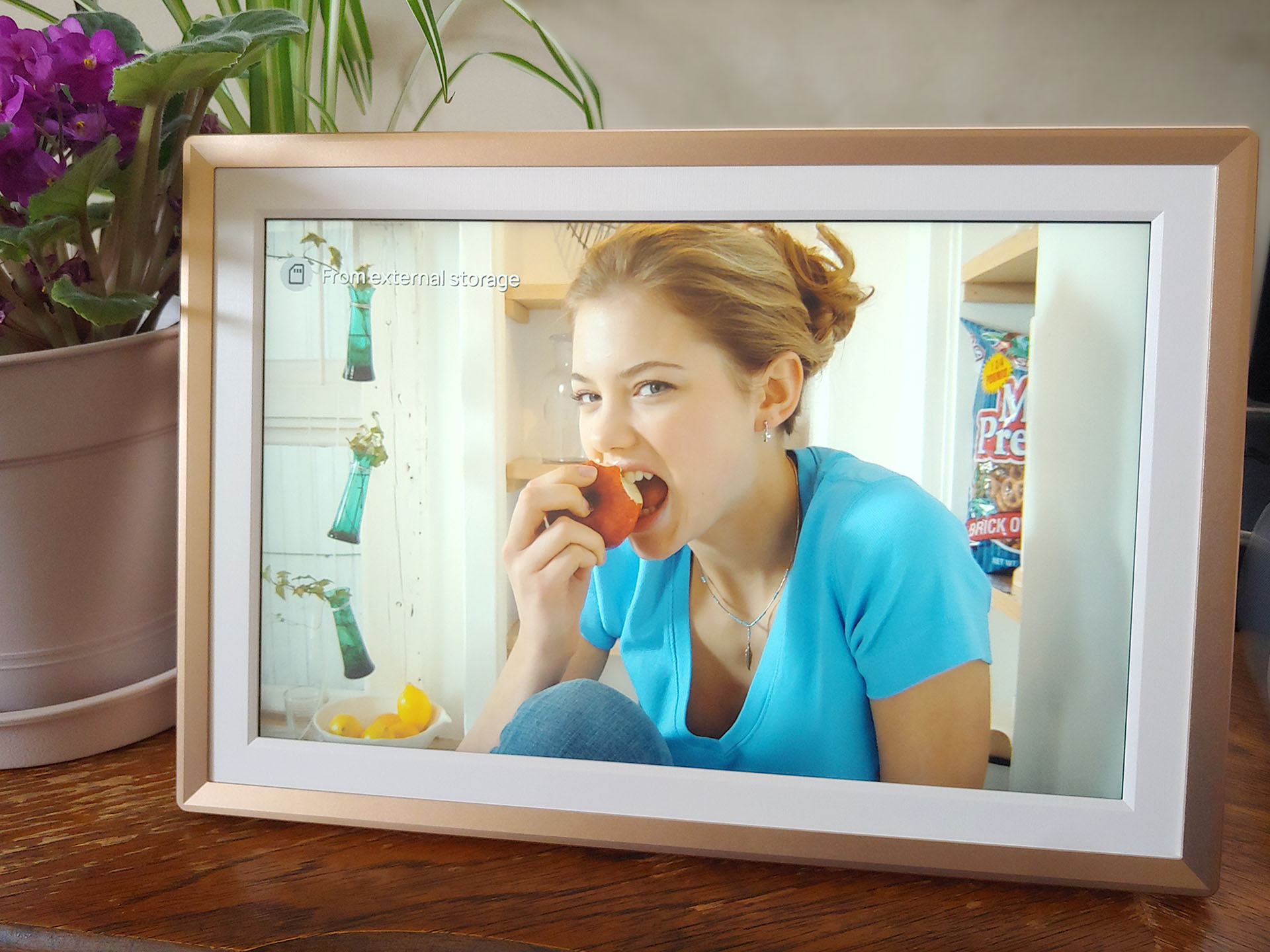A képkeret 32 GB belső tárhelyet és korlátlan felhőalapú tárhelyet tartalmaz. A felhasználók opcionális feliratokat adhatnak hozzá, és a fotókat táj- vagy portré tájoláshoz vághatják, bár a haladó szerkesztéshez külső alkalmazásokra van szükség. A rövid videoklipek is támogatottak.