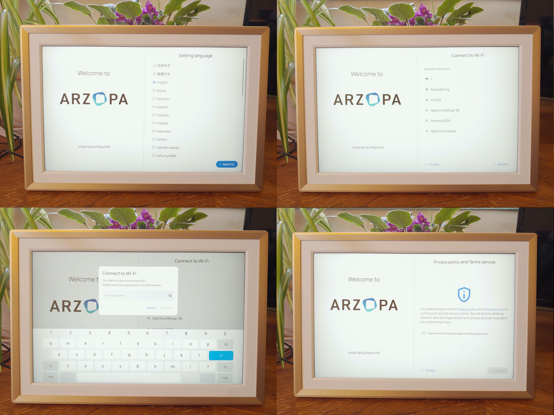 A hardver kezdeti beállítása több képernyőből áll, beleértve a nyelv kiválasztását, az opcionális Wi-Fi beállítását, a szolgáltatási feltételek és adatvédelmi irányelvek elfogadását, valamint az idő/idő beállításait. A felhasználók az utolsó képernyőn megjelenő QR-kódot megoszthatják barátaikkal és családtagjaikkal, hogy hozzáférjenek a képkerethez, vagy ajándékkódot adhatnak hozzá, hogy megnézhessék az ajándékba kapott fényképeket, például az esküvőn készülteket. A felülvizsgálati egységen firmware-frissítésre volt szükség, amelynek telepítése néhány percet vett igénybe.