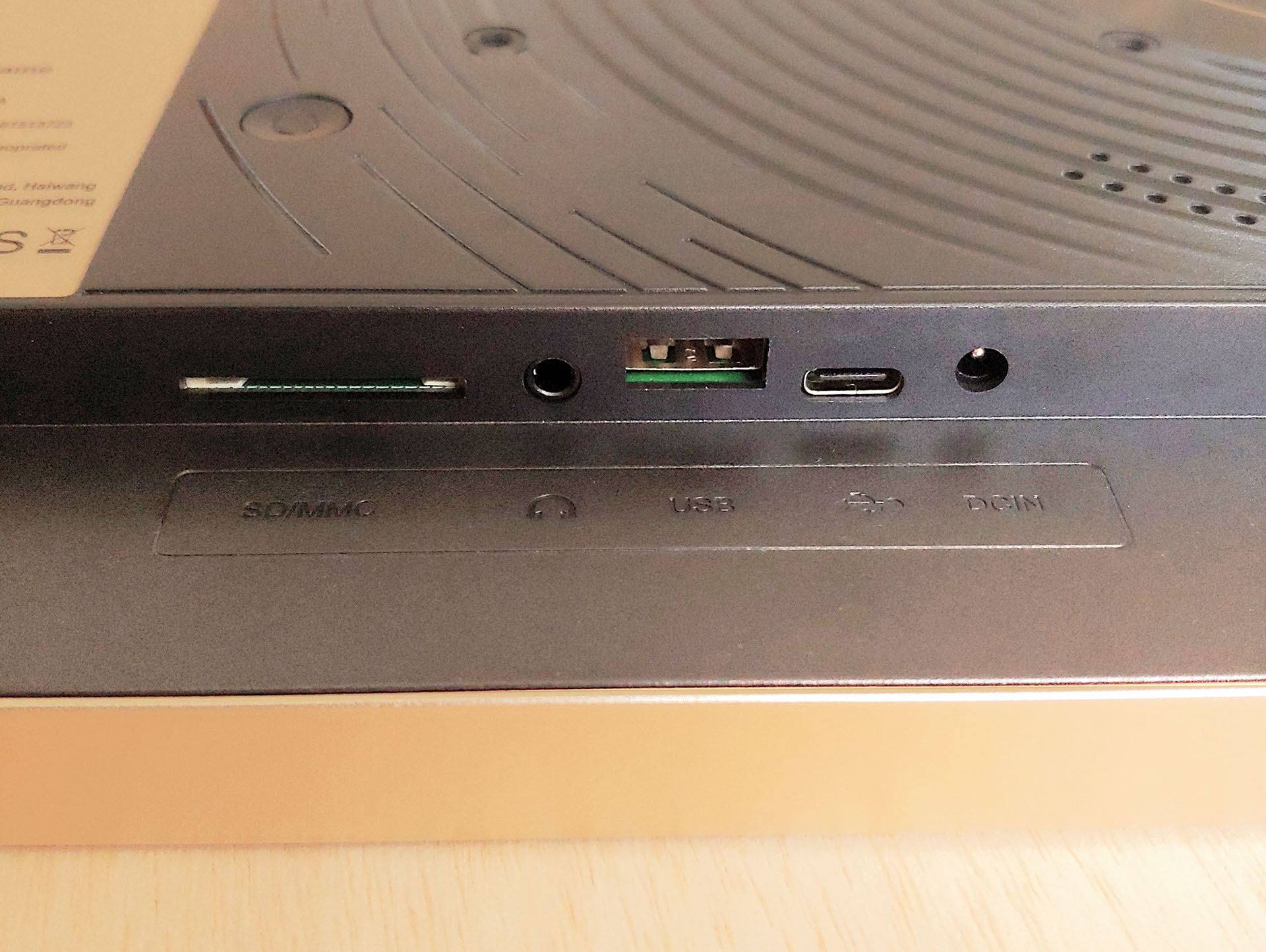 Az összes port - beleértve a tápellátást, az USB-A, USB-C, az SD-kártyahelyet és a 3,5 mm-es fejhallgató-csatlakozót - a hátoldalon található. Nincs bekapcsológomb, így a készüléket a csatlakoztatás bekapcsolja, a kikapcsolás vagy az alvó üzemmód pedig a menüben történik.