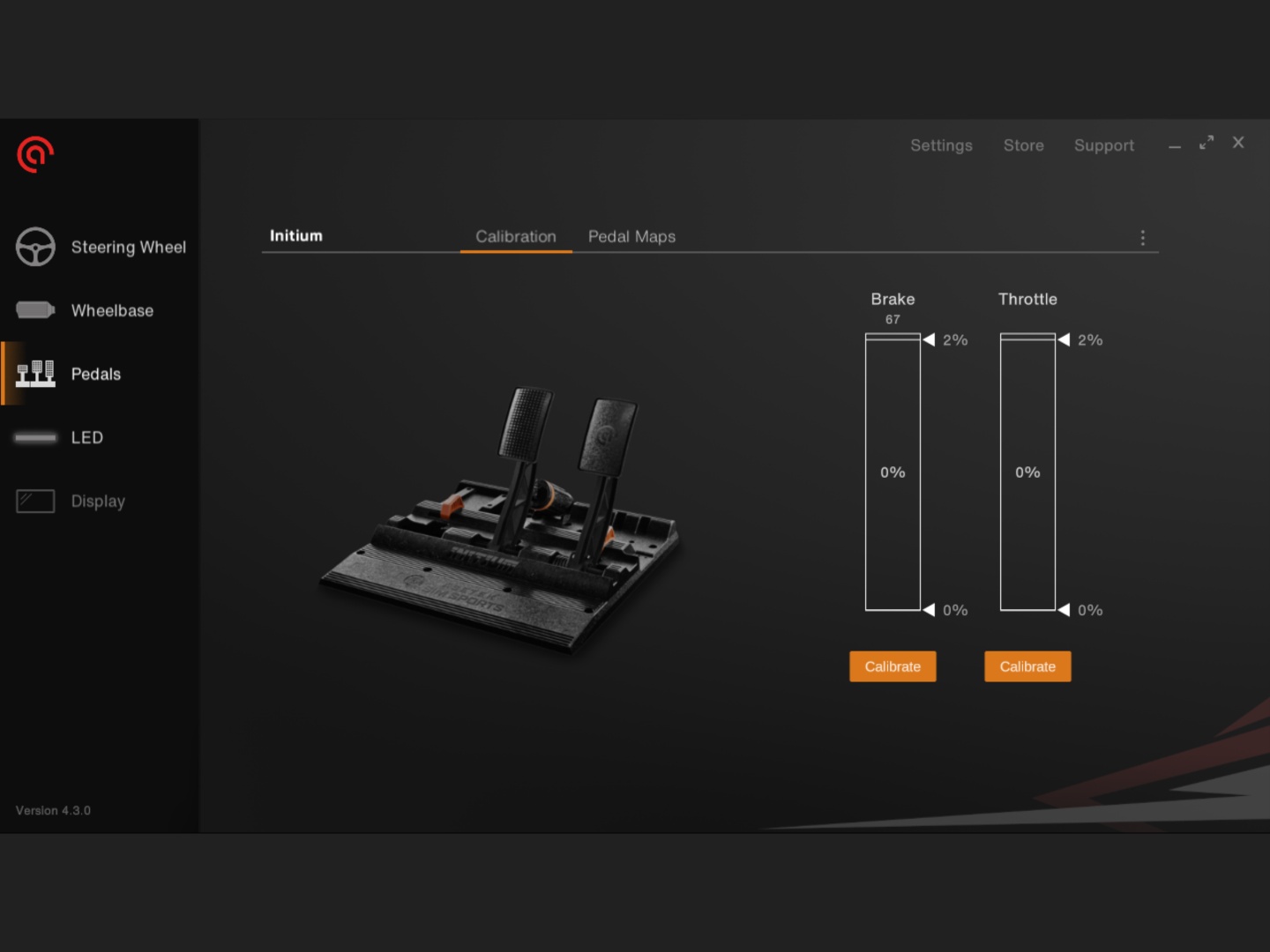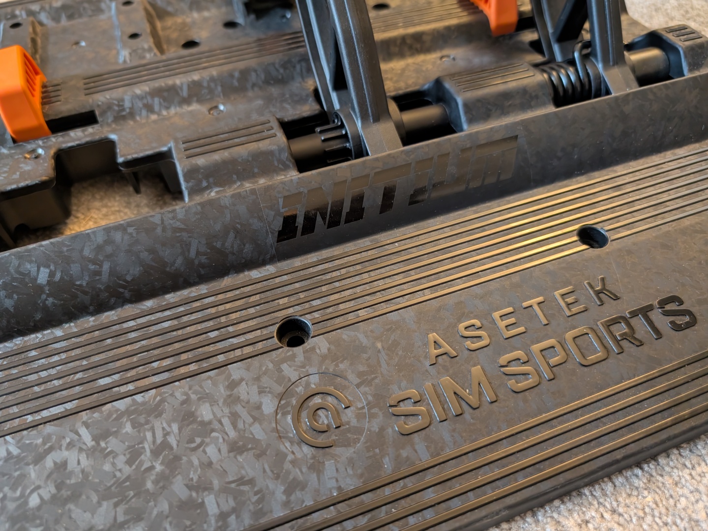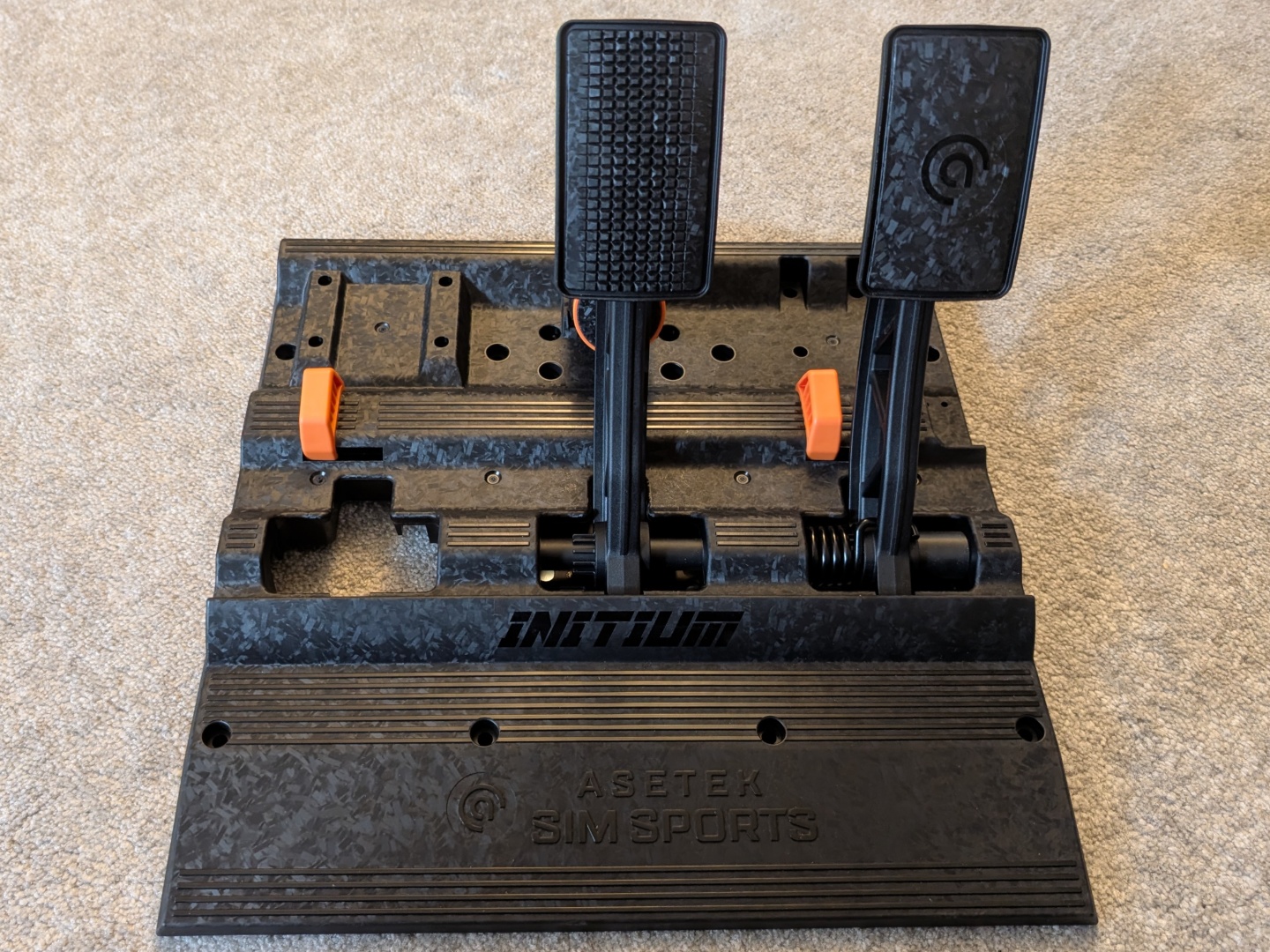A pedálokra térve, az Asetek a prémium szettekből származó tanulságait vitte bele az Initium pedálkészletbe. Van gázpedál és fék, és van hely a kuplungpedálnak is. Mindkettő Hall-érzékelőket használ a bemenethez, a fékpedál pedig kétlépcsős rugós működtetéssel rendelkezik. A pedálok rendelkeznek egy "Cockpit" és egy "Floor" üzemmóddal is, amely lehetővé teszi a gázpedál és a fék szögének megváltoztatását, attól függően, hogy hogyan használják. A pedálkészlet üvegszál-erősítésű kompozit anyagból készült, és a kivitel nagyon jól néz ki.