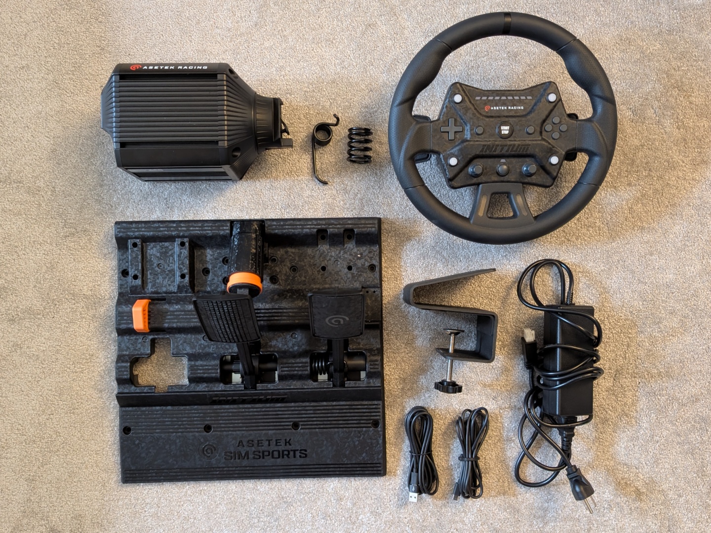 Ahhoz képest, hogy egy csomag, az Asetek Initium készlet külön dobozokban érkezik a kerékagy, a kormánykerék és a pedálok számára. A Moza, a Turtle Beach és mások csomagjai általában egyetlen dobozba vannak csomagolva, így sokkal könnyebb őket elrakni, amikor nem használják őket. Ami a csomagolást illeti, minden habszivaccsal védett és könnyen összeszerelhető. A rögzítő hardverek, az asztali bilincs és a kábelek is szépen elrendezve vannak. Az Asetek extra rugókat is biztosít a fékhez és a gázkarhoz, hogy növelje azok merevségét.