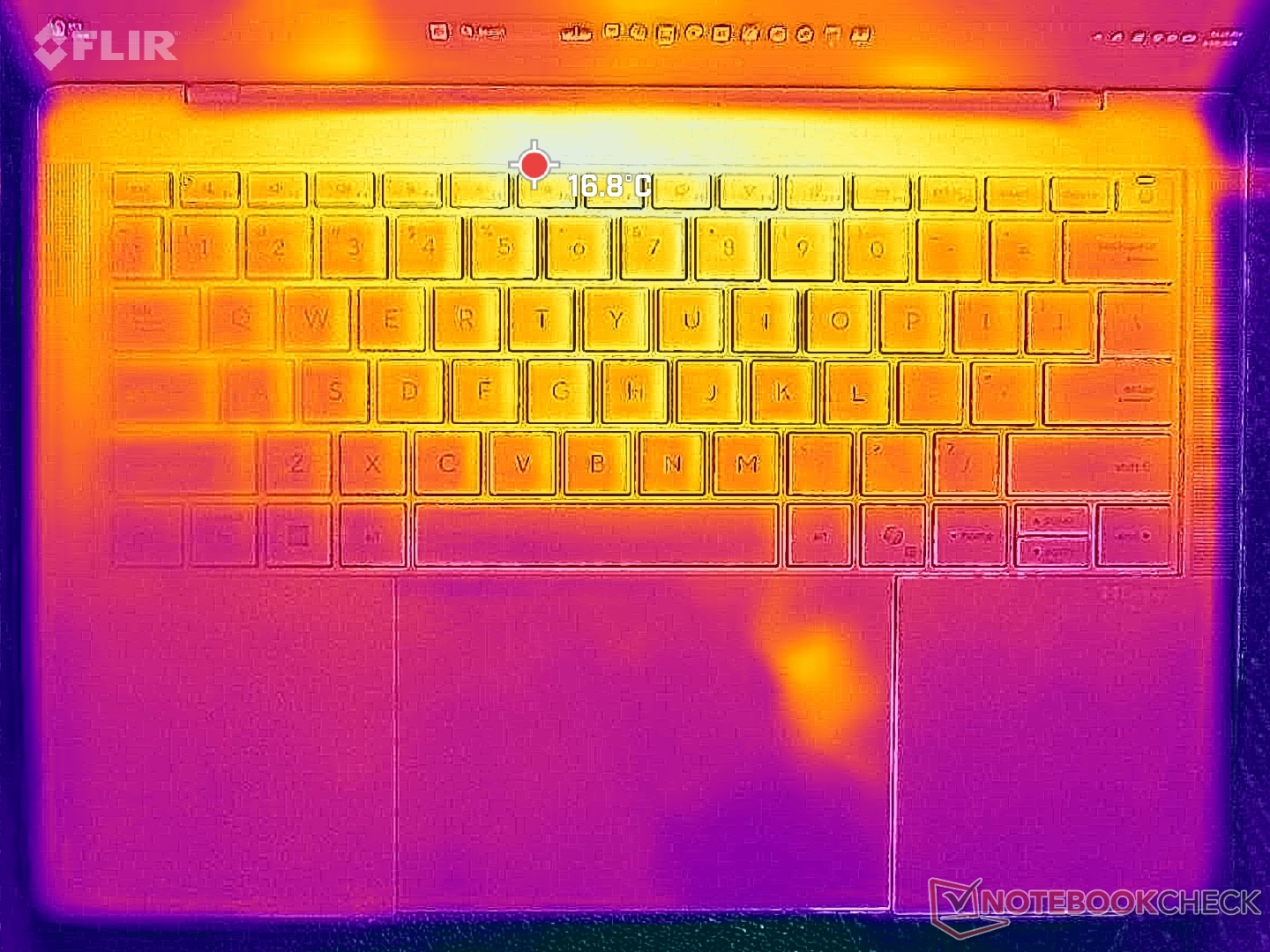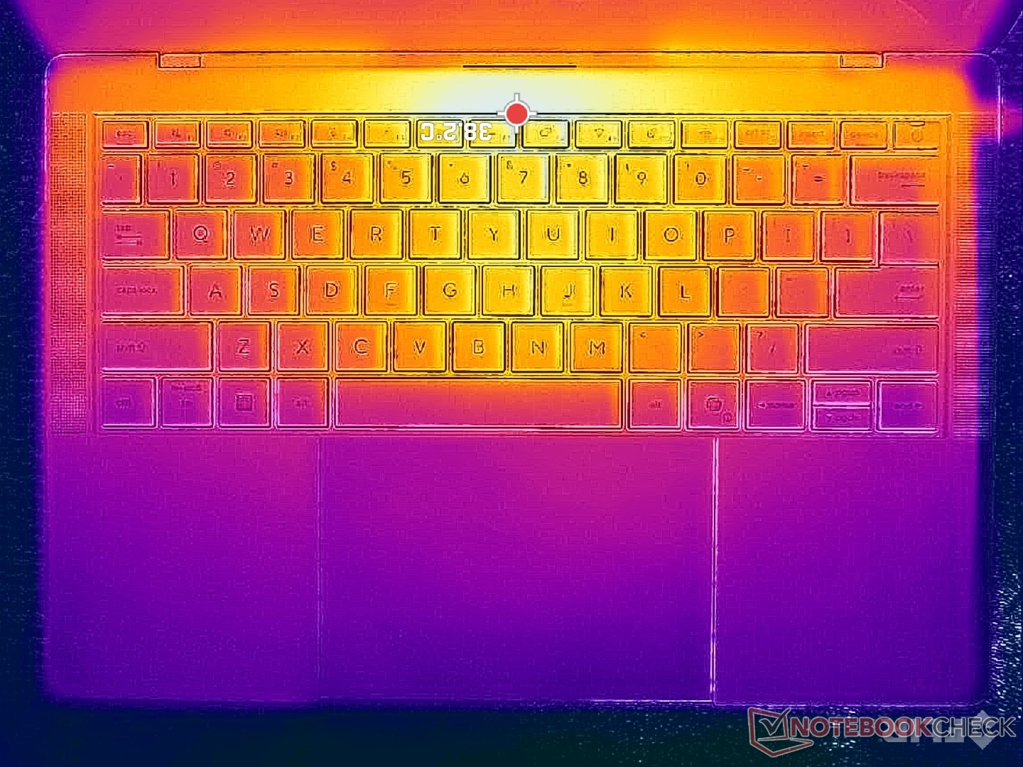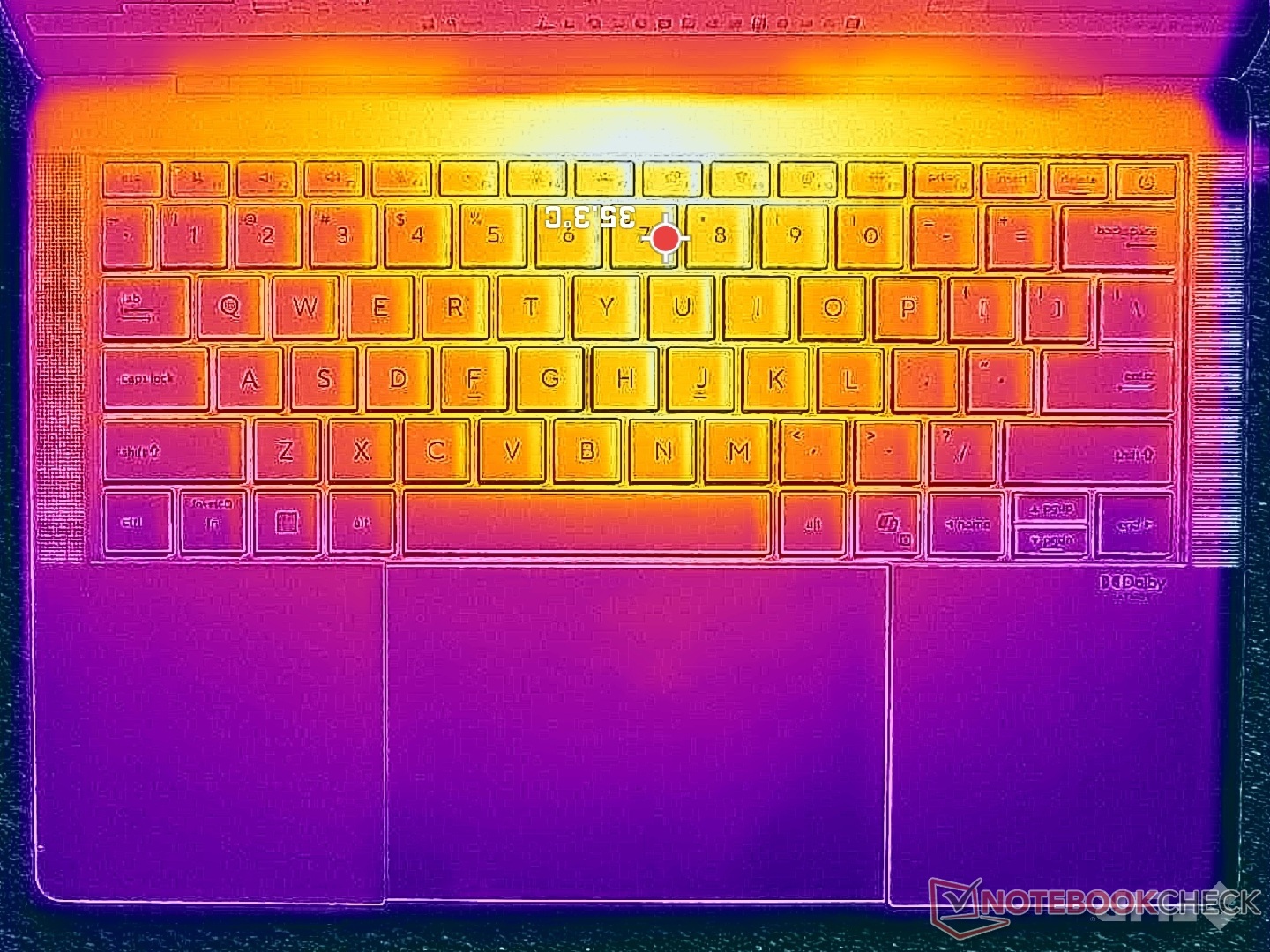 A felületi hőmérséklet-gradiens többé-kevésbé szimmetrikus az alatta lévő hűtőoldat miatt. A billentyűzet középső és alsó paneljén található forró pontok igényes terhelés hosszabb ideig történő működtetése esetén akár 41 °C-ot is elérhetik, ami valamivel hűvösebb, mint a billentyűzet középső és alsó paneljén HP EliteBook Ultra G1i 14 a lassabb Lunar Lake-V CPU-val szerelt gépen.