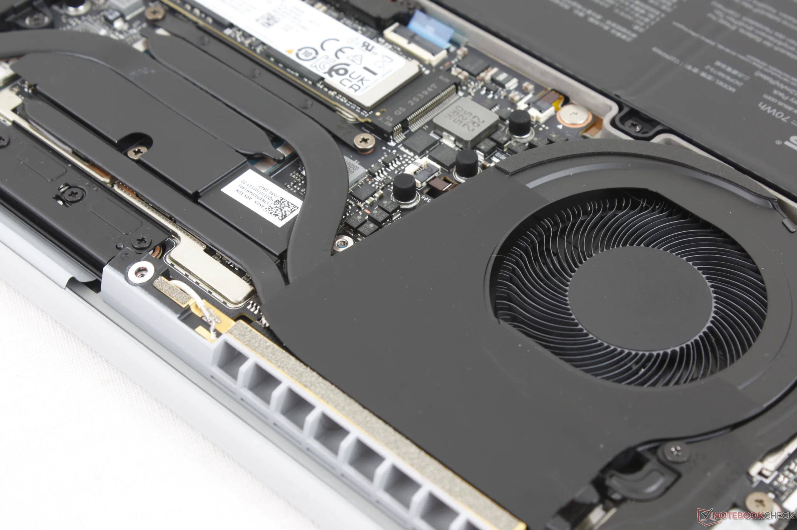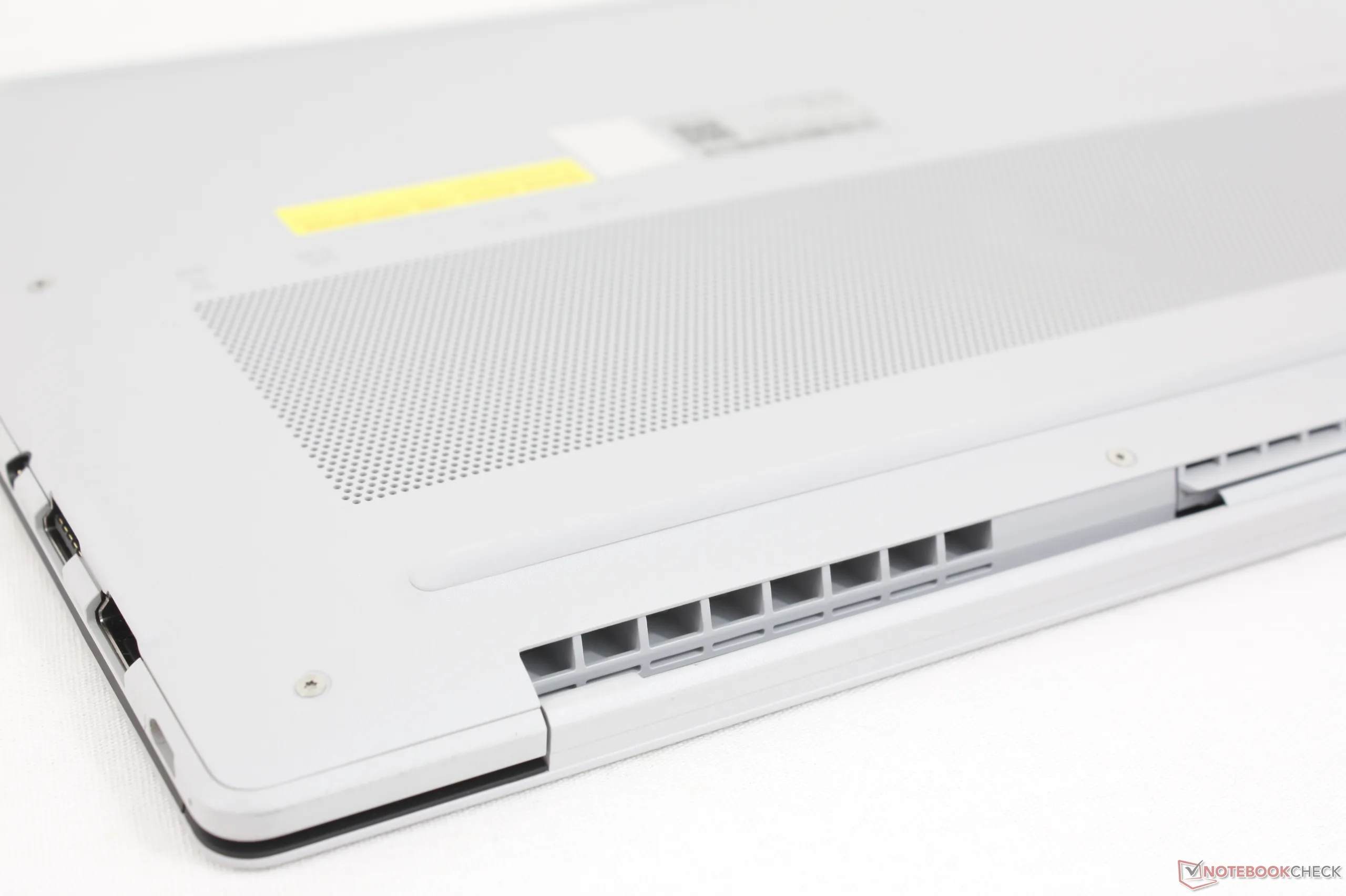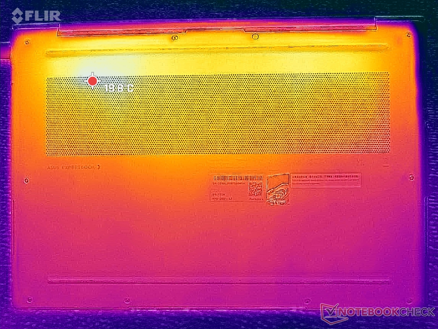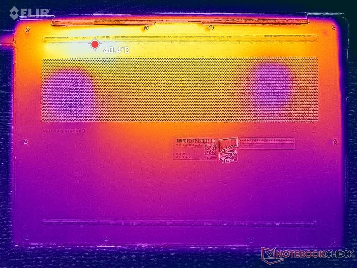 A felületi hőmérséklet-gradiens többé-kevésbé szimmetrikus az alatta lévő hűtőoldat miatt. A billentyűzet középső és alsó paneljén található forró pontok igényes terhelés hosszabb ideig történő működtetése esetén akár 41 °C-ot is elérhetik, ami valamivel hűvösebb, mint a billentyűzet középső és alsó paneljén HP EliteBook Ultra G1i 14 a lassabb Lunar Lake-V CPU-val szerelt gépen.