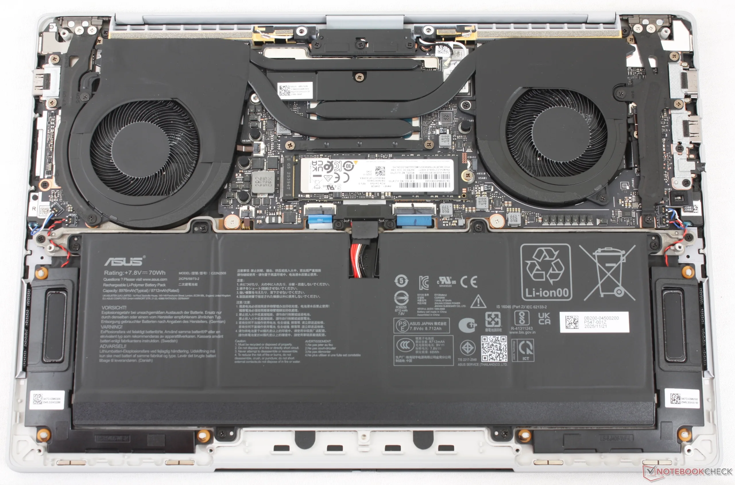 Míg a 70 Wh kapacitás a 14 hüvelykes méretosztályban átlagosnak számít, az akkumulátor élettartama minden, csak nem az. Az Asus valamivel több mint 16 órán át bírja a valós WLAN-böngészést az automatikus leállás előtt, hogy több órával hosszabb legyen, mint sok más szubnotebook, beleértve a vállalat saját AMD-üzemű ExpertBook PM3406.