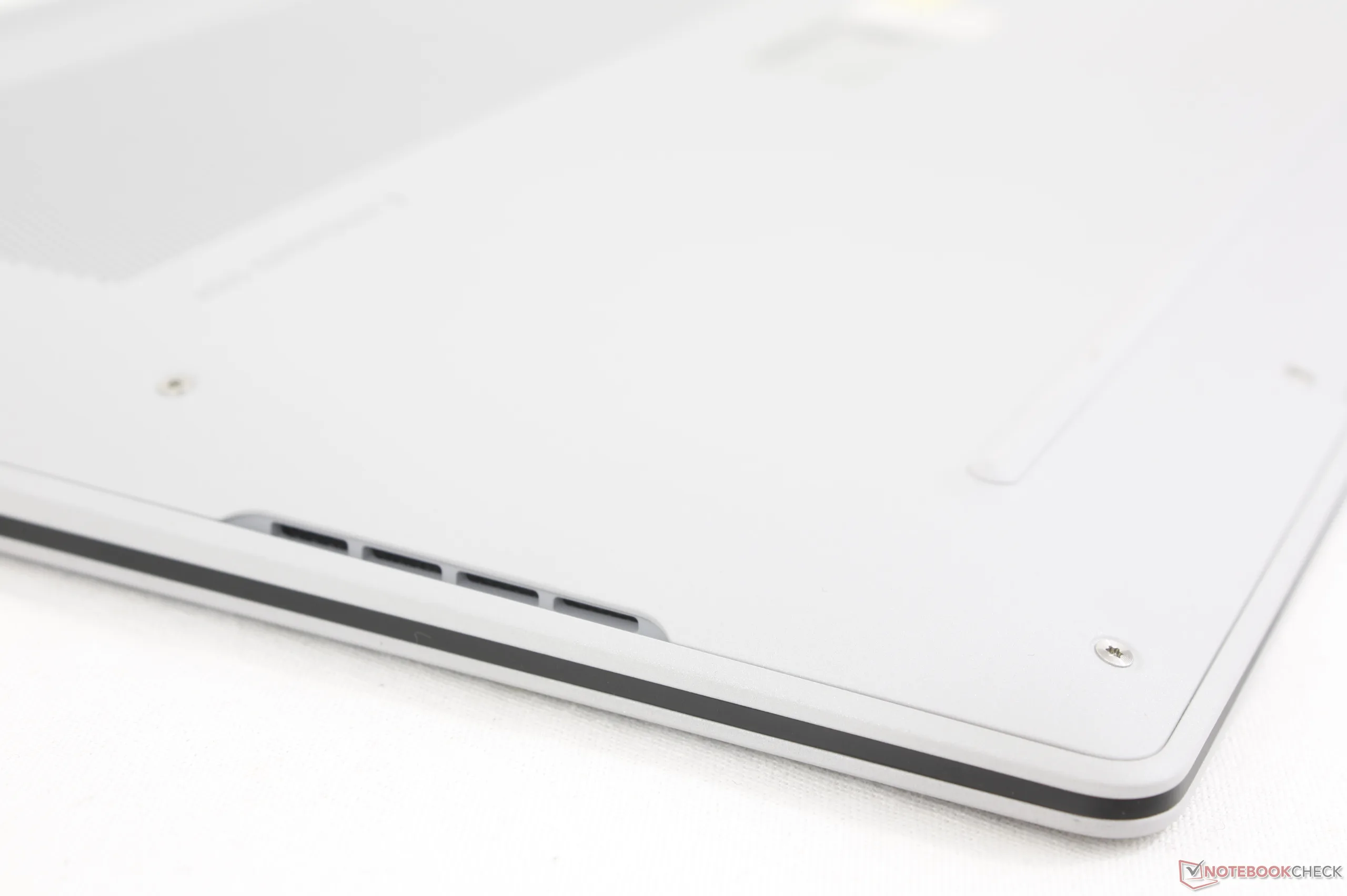 A vonzó megjelenés mellett az ExpertBook Ultra váza egyedülálló a 9H "nano-kerámia" bevonattal, amely hatékonyabban ellenáll a karcolásoknak és ujjlenyomatoknak, mint a legtöbb más csúcskategóriás laptop szokásos csiszolt fémötvözete. Textúráját tekintve matt felülete érdesebb és kissé szemcsés, szemben az alternatívák szupersima és fényes csillogásával. Az alváz merevsége a MIL-STD 810H tanúsítvánnyal többnyire megmarad, és csak az alap és a fedél mentén hajlik meg valamivel jobban, ha összehasonlítjuk valami olyannal, mint a Razer Blade 14.