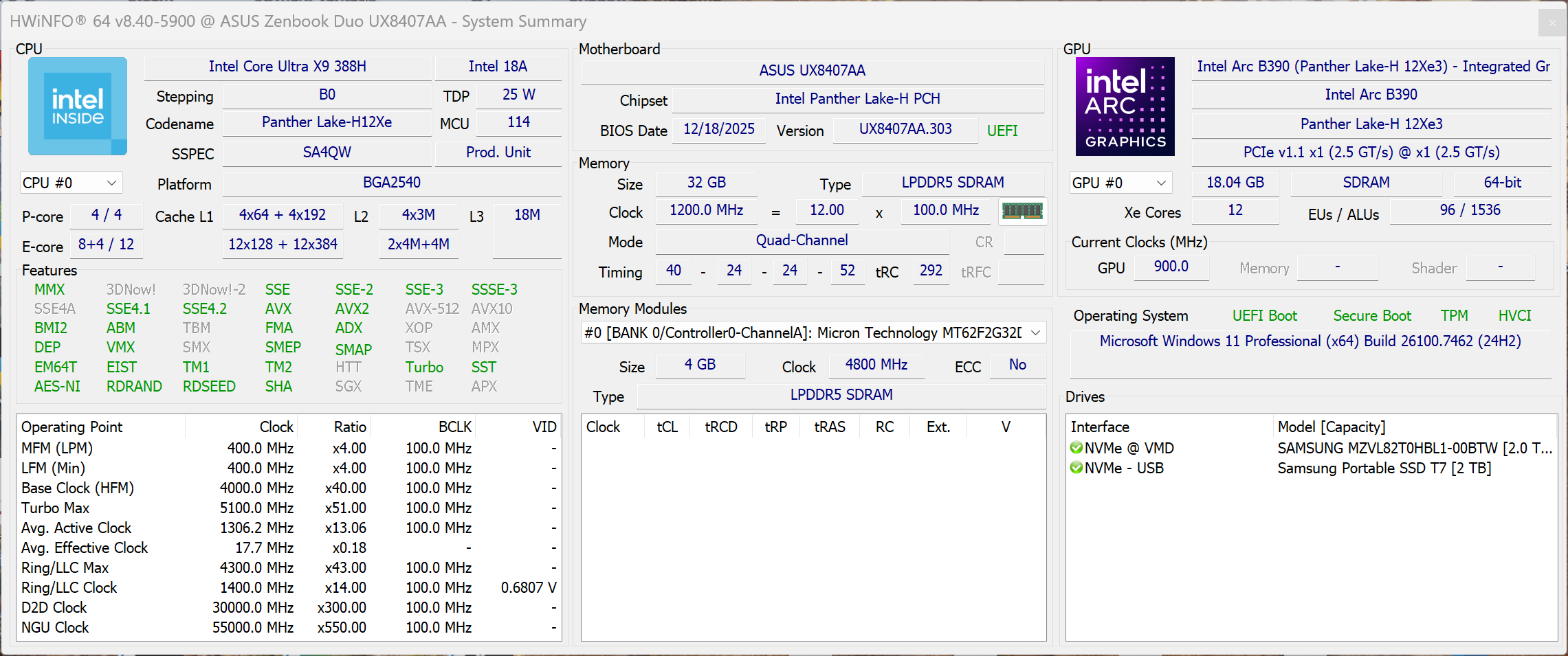 | Asus ZenBook Duo UX8407AA Intel Core Ultra X9 388H ⎘ Intel Arc B390 12 Xe3 Panther Lake iGPU ⎘ 32 GB Memória, 2048 GB SSD | Amazon: 1. $2,469.99 ASUS Zenbook Duo ux8406 AI P... 2. $1,692.00 ASUS Zenbook Duo Laptop, Dua... 3. $1,899.99 ASUS Zenbook DUO AI Powered ... List Price: 2599€ | 1.7 kg | 23.4 mm | 14.00" 2880x1800 243 PPI OLED | |