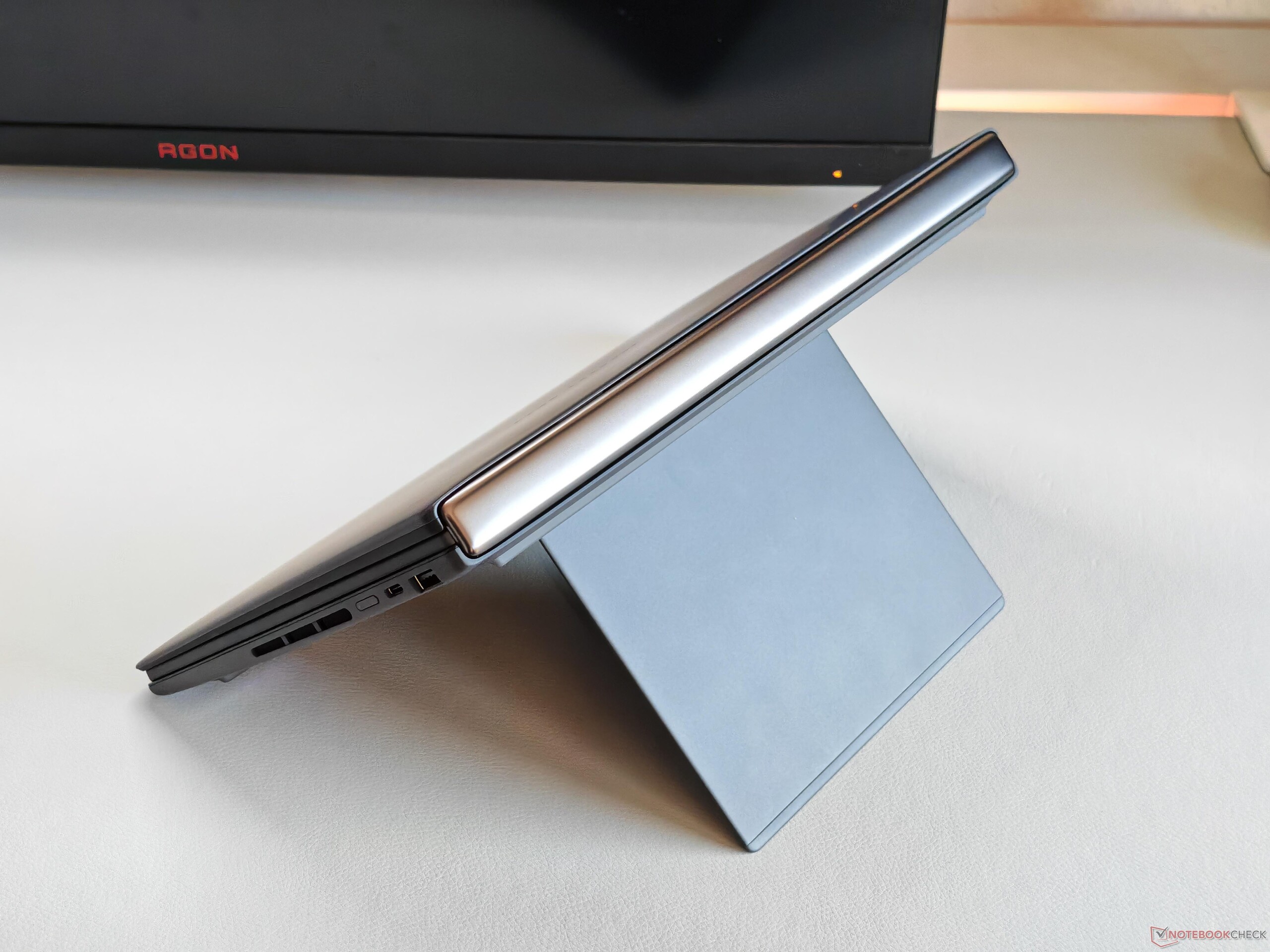 Az Asus az UX4807-es modellel masszívan áttervezte a ZenBook Duo-t, kiküszöbölve a régebbi modellek számos gyengeségét. Ez az új zsanérkialakítással kezdődik, amely a két képernyőt közelebb helyezi egymáshoz. A könyvként kinyitott gép használata így sokkal kényelmesebbé vált. Bár ez az új modell egy kicsit vastagabb, egyfajta kompenzációként könnyebb lett. Csak győződjön meg róla, hogy valóban jó hasznát veszi a két képernyőnek, mert különben nincs sok értelme egy ilyen (viszonylag) vastag rendszer megvásárlásának.