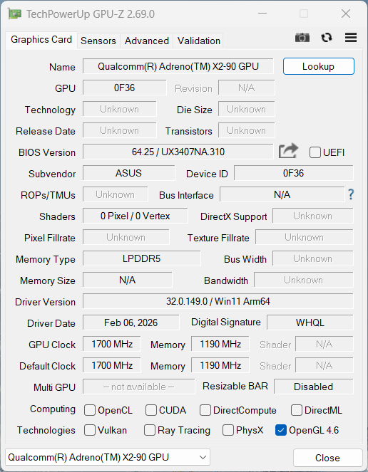 | Asus Zenbook A14 UX3704NA X2E-88-100, X2-90, Micron 2600 1TB MTFDKBA1T0QHK, OLED, 1920x1200, 14" | Apple MacBook Air 13 M5 M5 10-Core, M5 8-Core GPU, Apple SSD AP0512Z, IPS, 2560x1664, 13.6" | Dell XPS 14 Core Ultra 7 355 Ultra 7 355, Intel Graphics 4 Xe3, WD PC SN7100S SDFPMSL-512G-1101, IPS, 1920x1200, 14" | Honor MagicBook Art 14 Snapdragon SD X Elite X1E-80-100, Adreno X1-85 3.8 TFLOPS, Micron MT001TAYAX8U40, OLED, 3120x2080, 14.6" | HP OmniBook X 14 SD X Elite X1E-78-100, Adreno X1-85 3.8 TFLOPS, WD PC SN560 SDDPNQE-1T00, IPS, 2240x1400, 14" | Lenovo Yoga Slim 7X 14Q8X9 SD X Elite X1E-78-100, Adreno X1-85 3.8 TFLOPS, Samsung PM9C1a MZAL81T0HDLB, OLED, 2944x1840, 14.5" | Samsung Galaxy Book4 Edge 14 SD X Elite X1E-80-100, Adreno X1-85 3.8 TFLOPS, , OLED, 2880x1800, 14" | Microsoft Surface Laptop 7 13.8 Copilot+ SD X Elite X1E-80-100, Adreno X1-85 3.8 TFLOPS, Samsung MZ9L4512HBLU-00BMV, IPS, 2304x1536, 13.8" | Asus ZenBook A14 UX3407QA SD X1-26-100, Adreno X1-45 1.7 TFLOPS, Micron 2500 1TB MTFDKBA1T0QGN, OLED, 1920x1200, 14" | Átlagos Qualcomm Adreno X2-90 | Az osztály átlaga Subnotebook | |