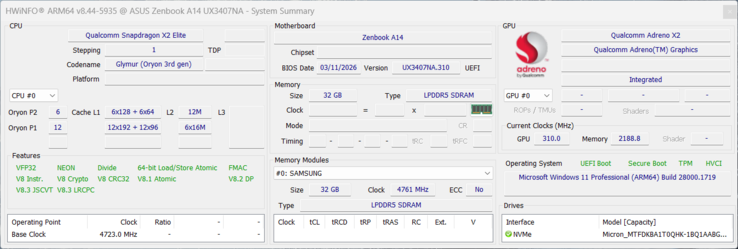 | Asus Zenbook A14 UX3704NA Qualcomm Snapdragon X2 Elite X2E-88-100 ⎘ Qualcomm Adreno X2-90 ⎘ 32 GB Memória, 1024 GB SSD | Amazon: 1. $629.00 ASUS Zenbook A14 Laptop 14" ... 2. $769.00 ASUS Zenbook A14 AI PC Lapto... 3. $829.00 ASUS Zenbook A14; Copilot+ P... | 992 g | 15.9 mm | 14.00" 1920x1200 162 PPI OLED | |